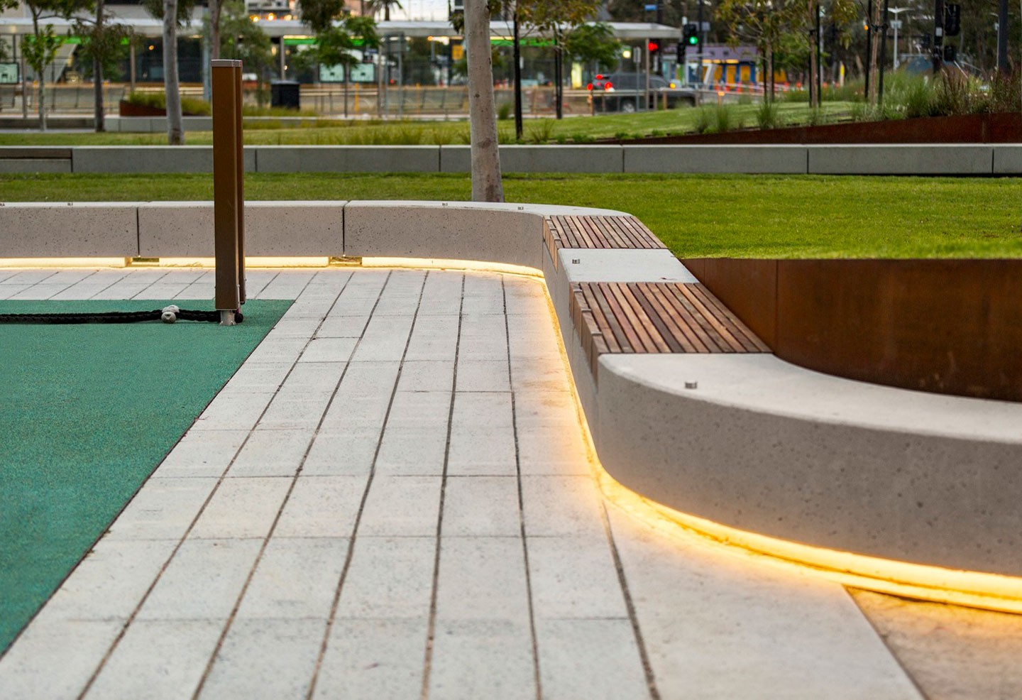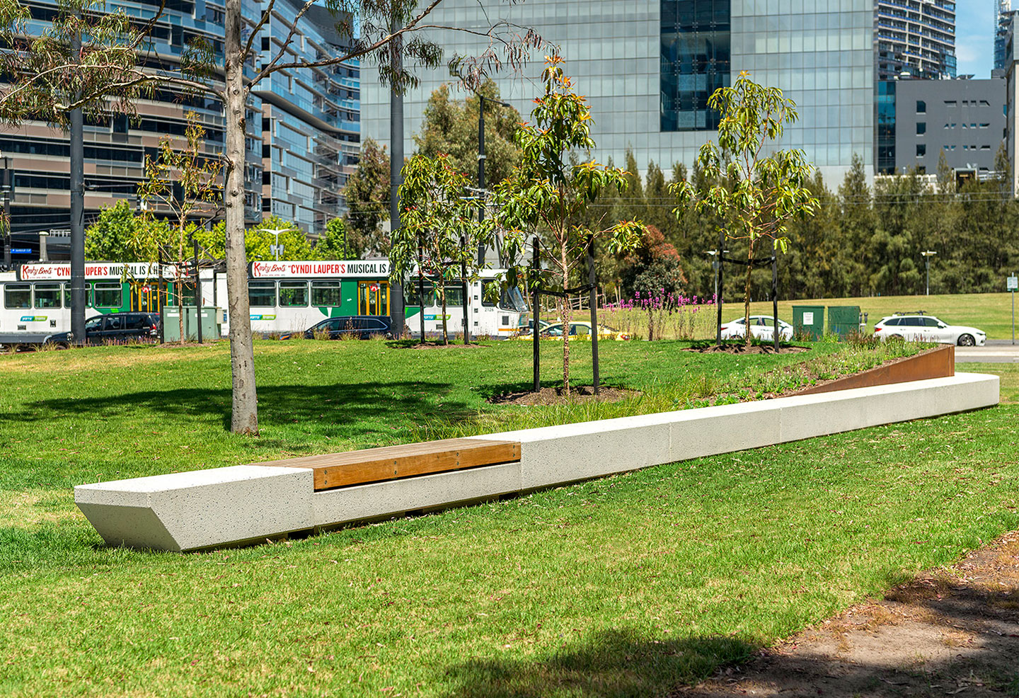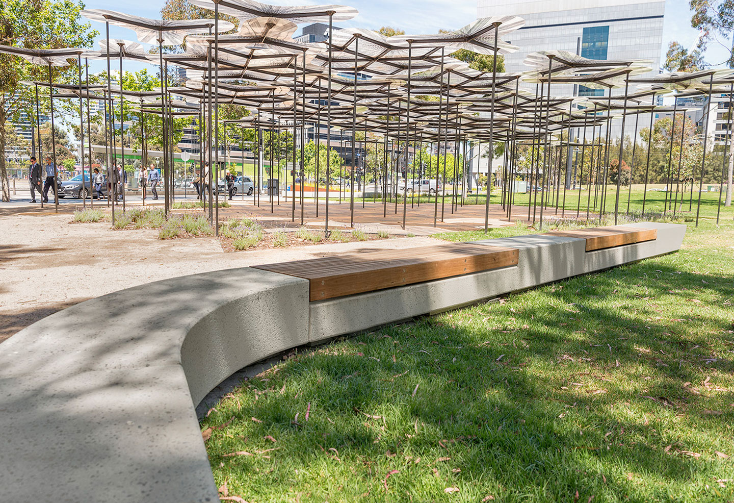 Designed by MALA studio and constructed by Maben Group, Stage 1 of the project housed the relocated MPavilion of 2015. The upgraded park design included sweeping concrete benches with slatted timber seat tops, extending throughout the park and creating ample seating amidst soft green spaces.