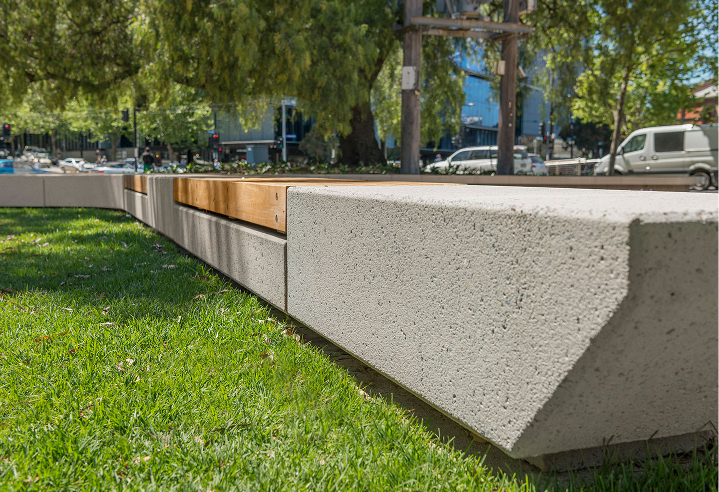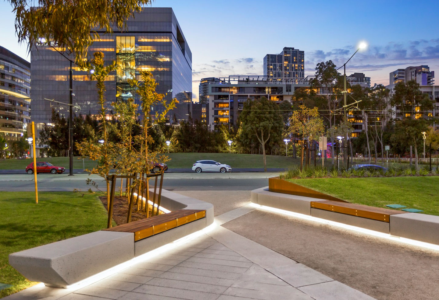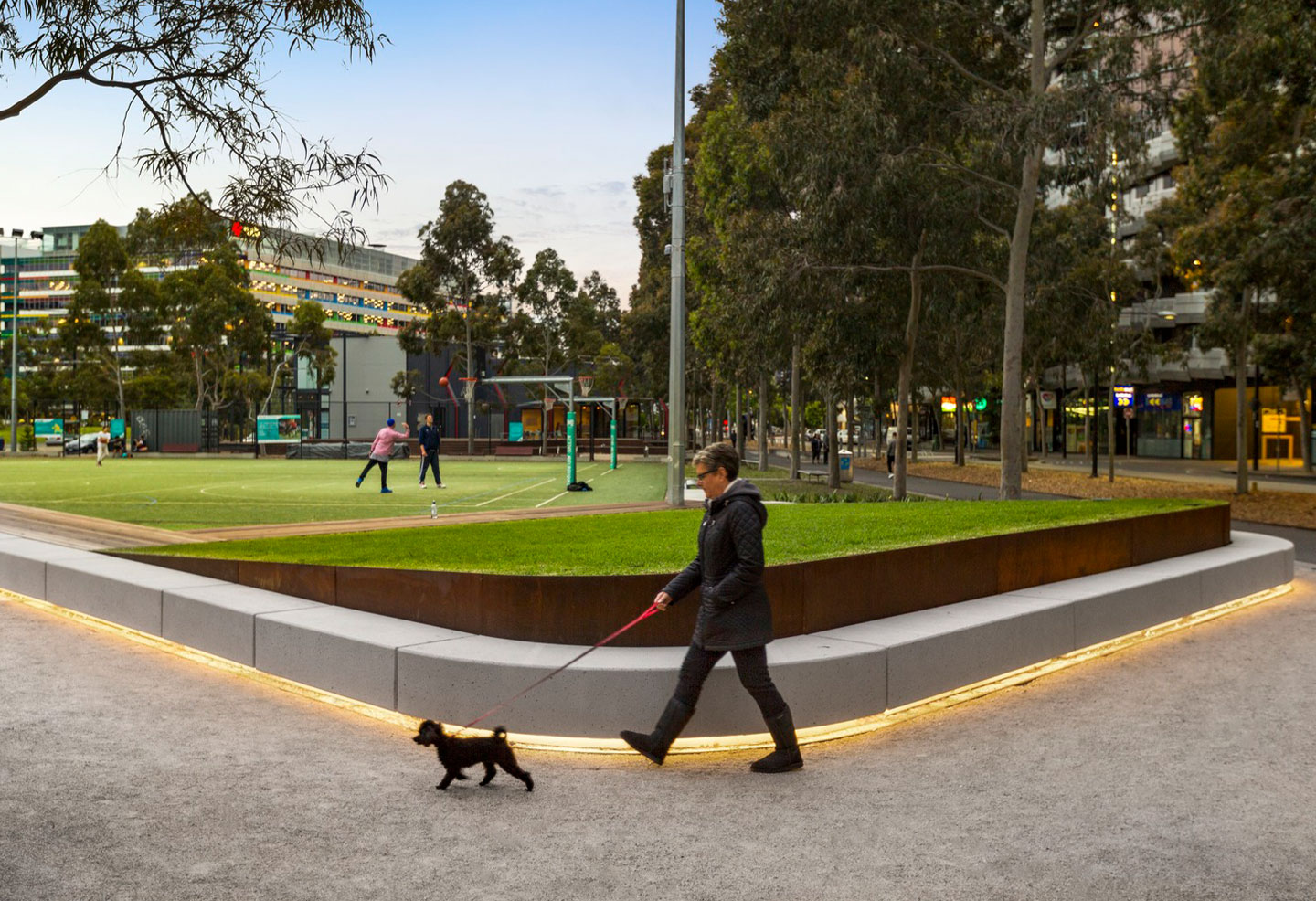Designed by MALA studio and constructed by Maben Group, Stage 1 of the project housed the relocated MPavilion of 2015. The upgraded park design included sweeping concrete benches with slatted timber seat tops, extending throughout the park and creating ample seating amidst soft green spaces.
