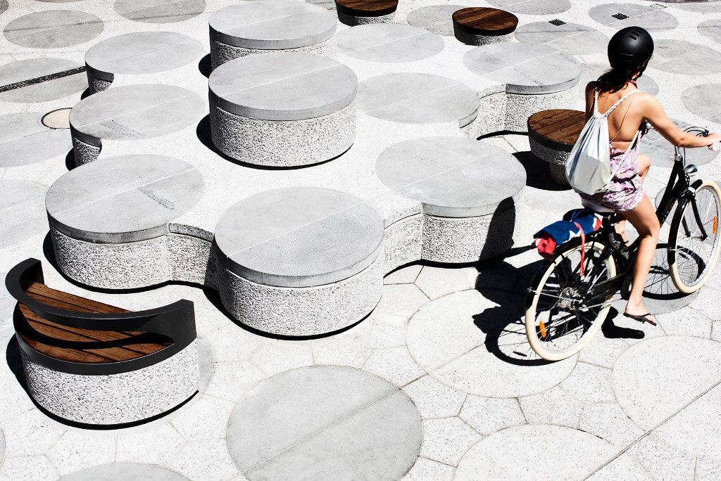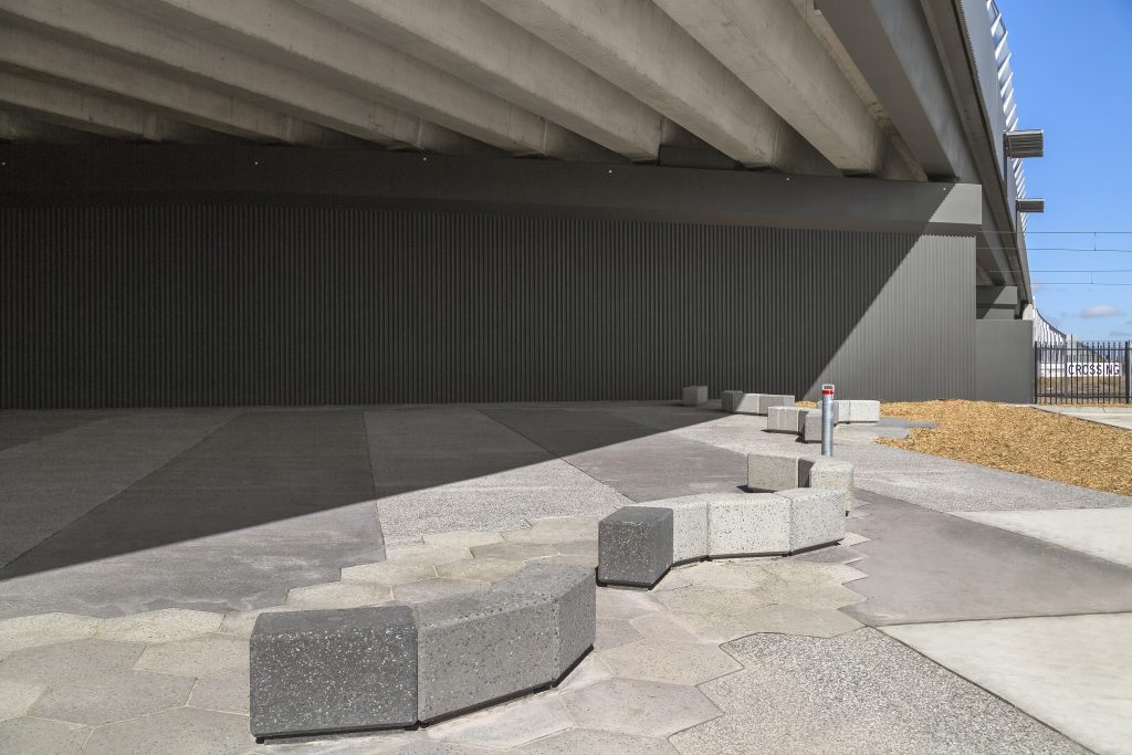 The new trafficable area underneath the raised Melton Highway bridge features custom concrete hexagonal paving and furniture modules by Anston.