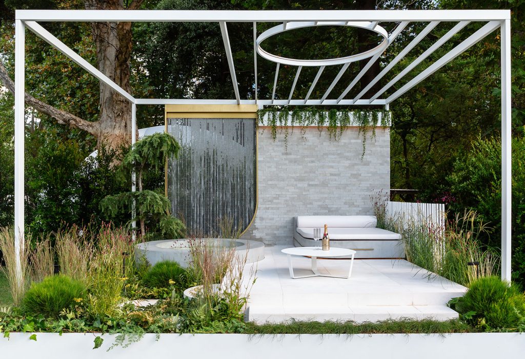 Creamy white circular pavers add a grounding element to the serene sanctuary of Esjay Landscapes’ Open Air Boutique Garden at MIFGS 2024.