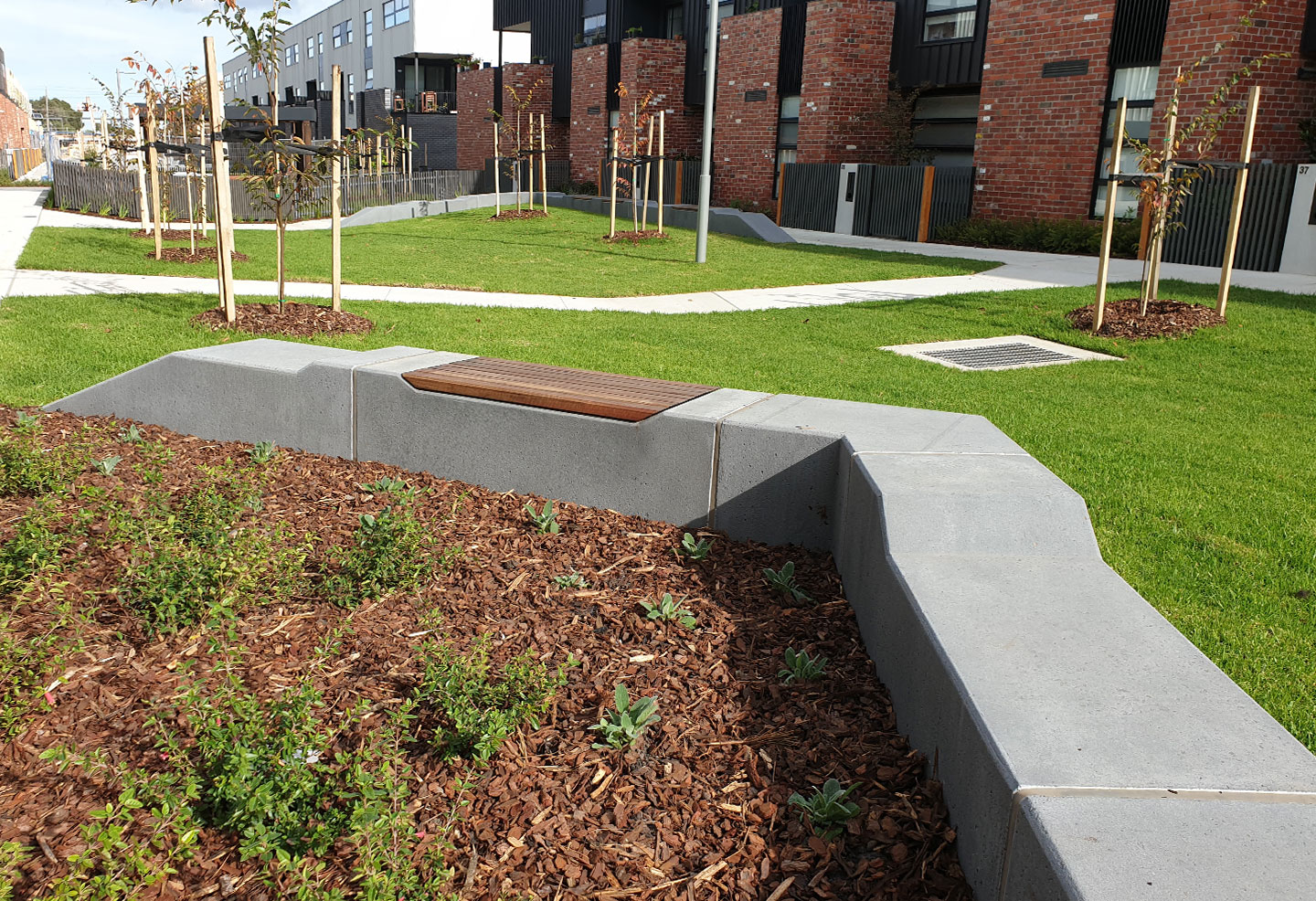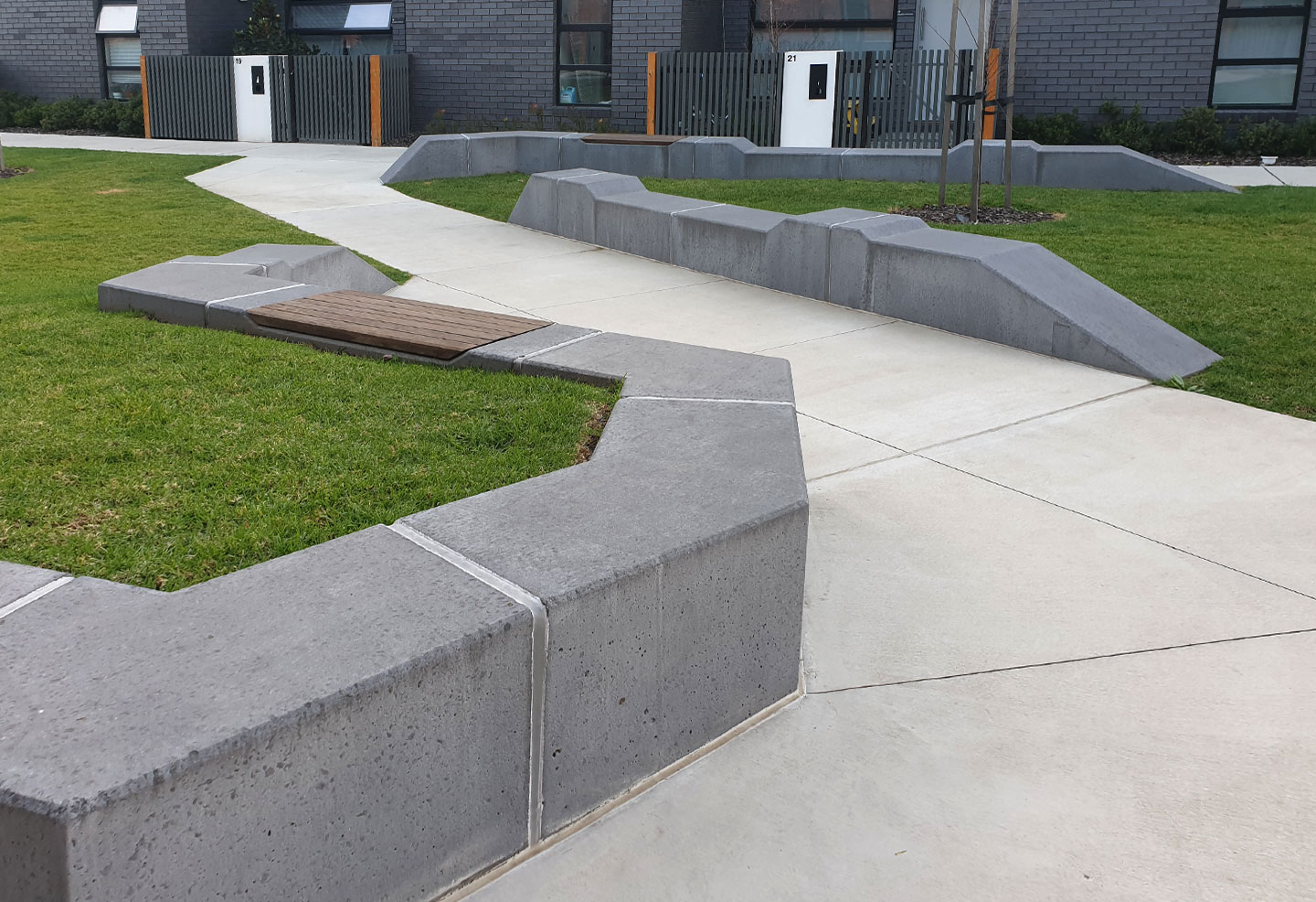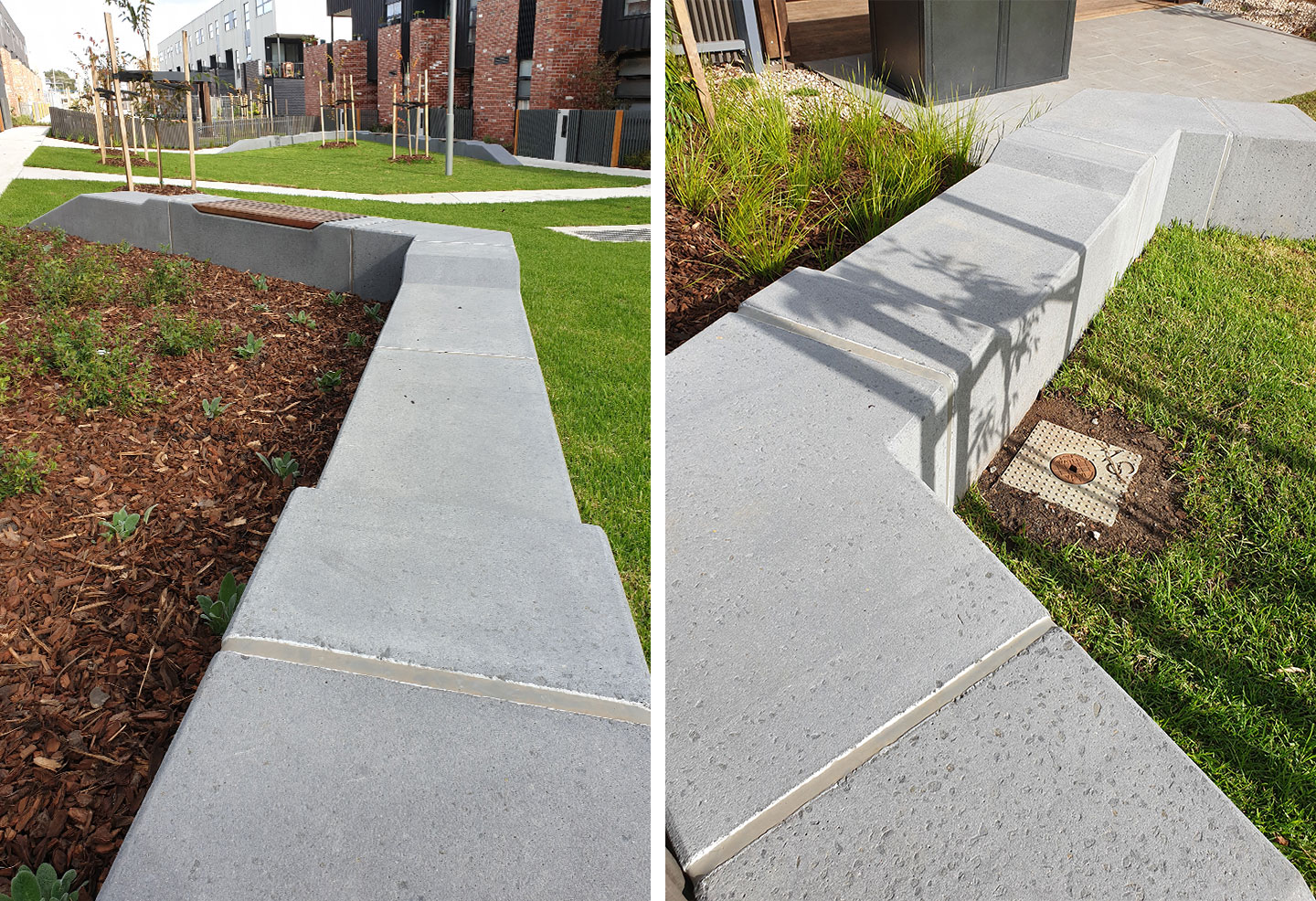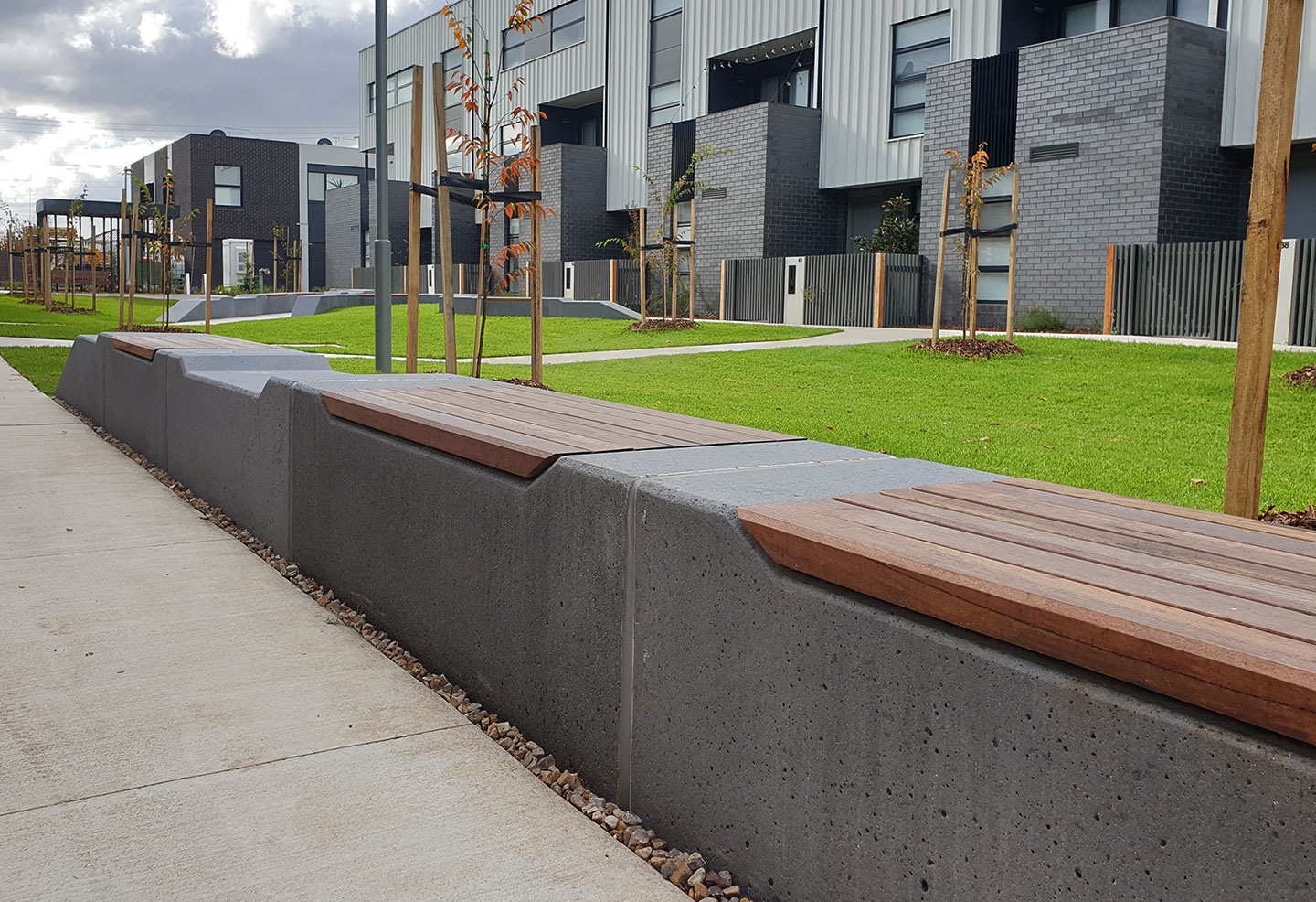 Anston (then SVC Urban) was commissioned by landscape contractor Naturform to supply multiple bespoke concrete bench seats for Alfie’s central park. Produced in sleek charcoal concrete with a subtle bluemetal exposed aggregate finish, the bench seat modules were used to construct a seating design wrapping around the garden spaces and through the central BBQ areas. Timber seat tops were included at certain points within the concrete benches, creating additional points of interest.