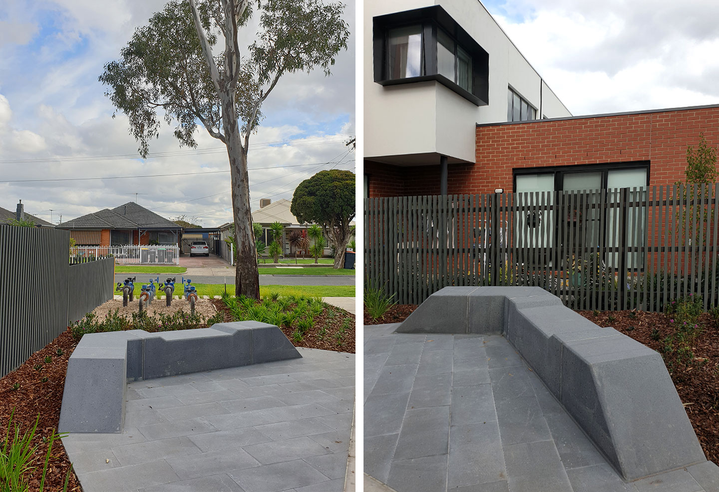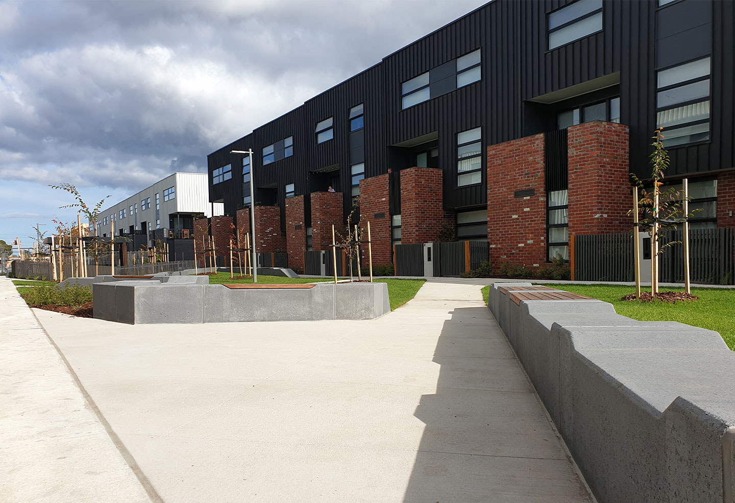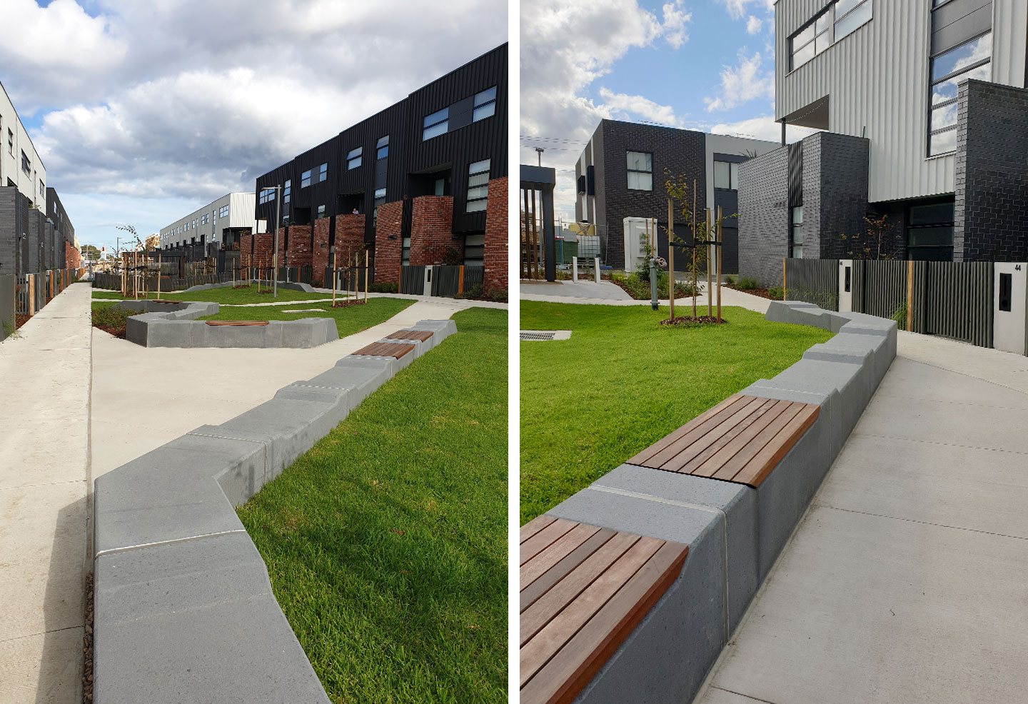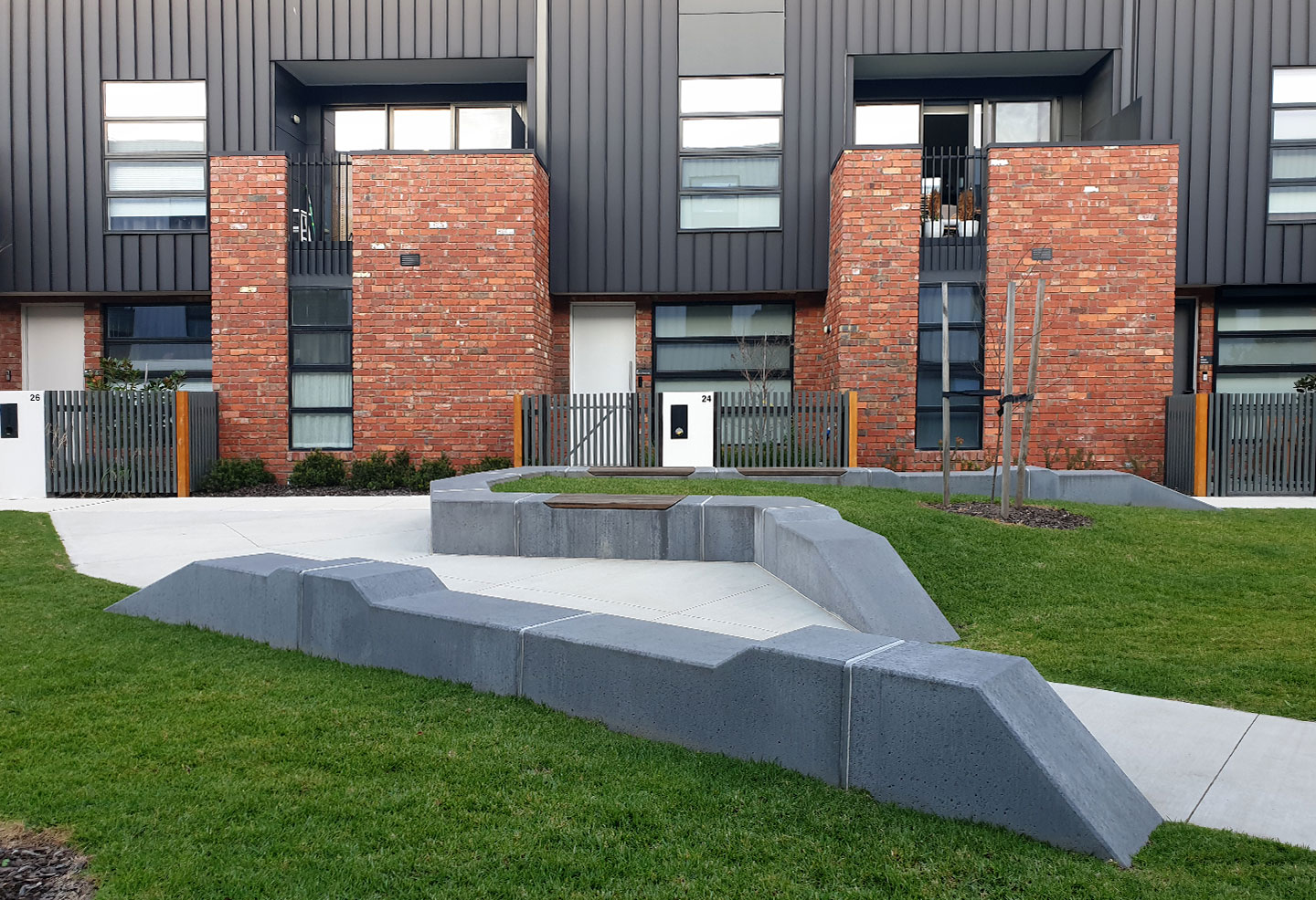 Anston (then SVC Urban) was commissioned by landscape contractor Naturform to supply multiple bespoke concrete bench seats for Alfie’s central park. Produced in sleek charcoal concrete with a subtle bluemetal exposed aggregate finish, the bench seat modules were used to construct a seating design wrapping around the garden spaces and through the central BBQ areas. Timber seat tops were included at certain points within the concrete benches, creating additional points of interest.