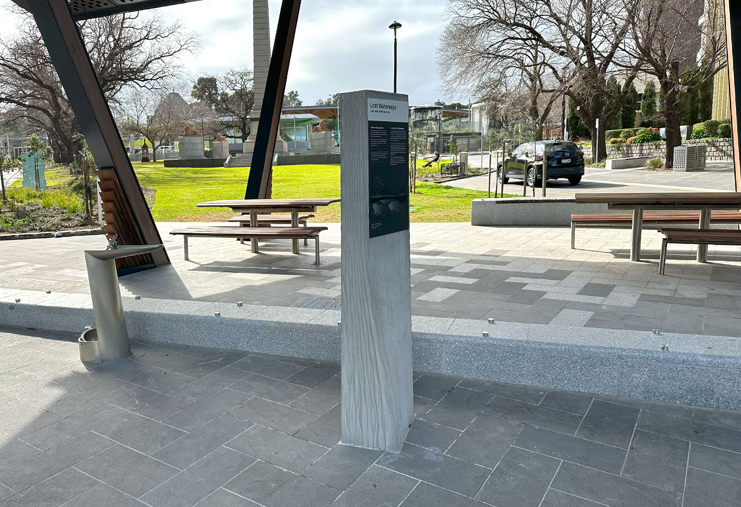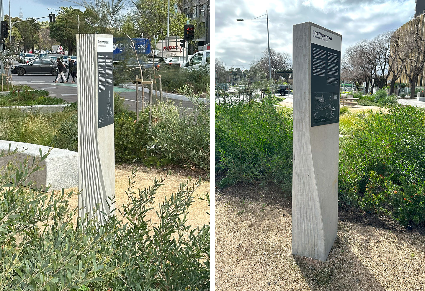 Each piece was handcrafted from architectural concrete, with crisp detailing and a soft finish that fits neatly into the broader palette of stone, steel and timber used throughout the project. These signs don’t just mark the station, they contribute to the identity of the space and help guide people as they move through it.