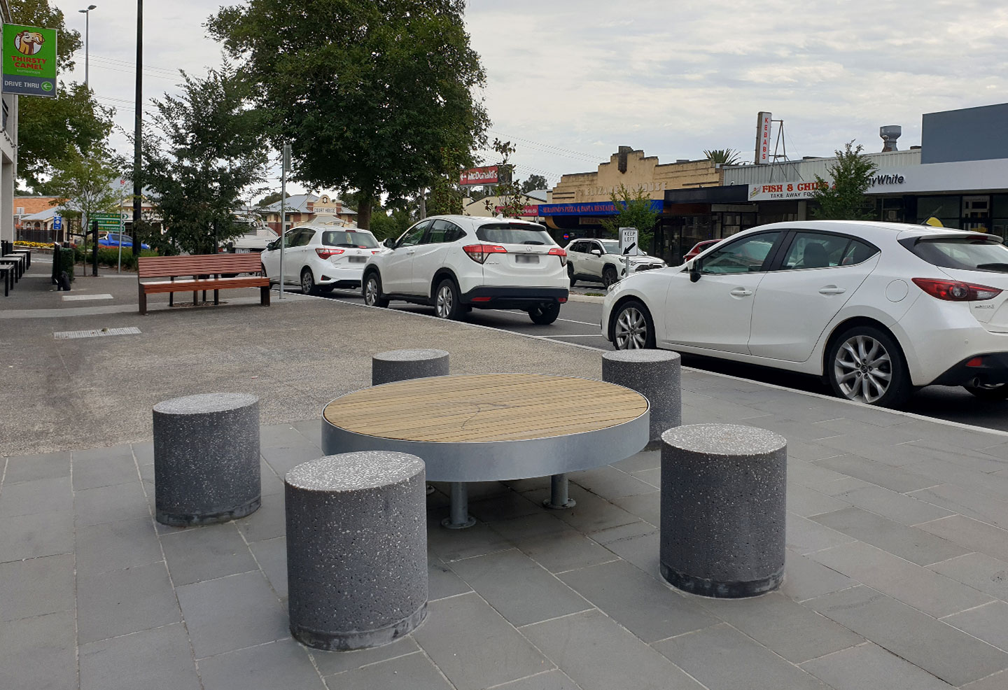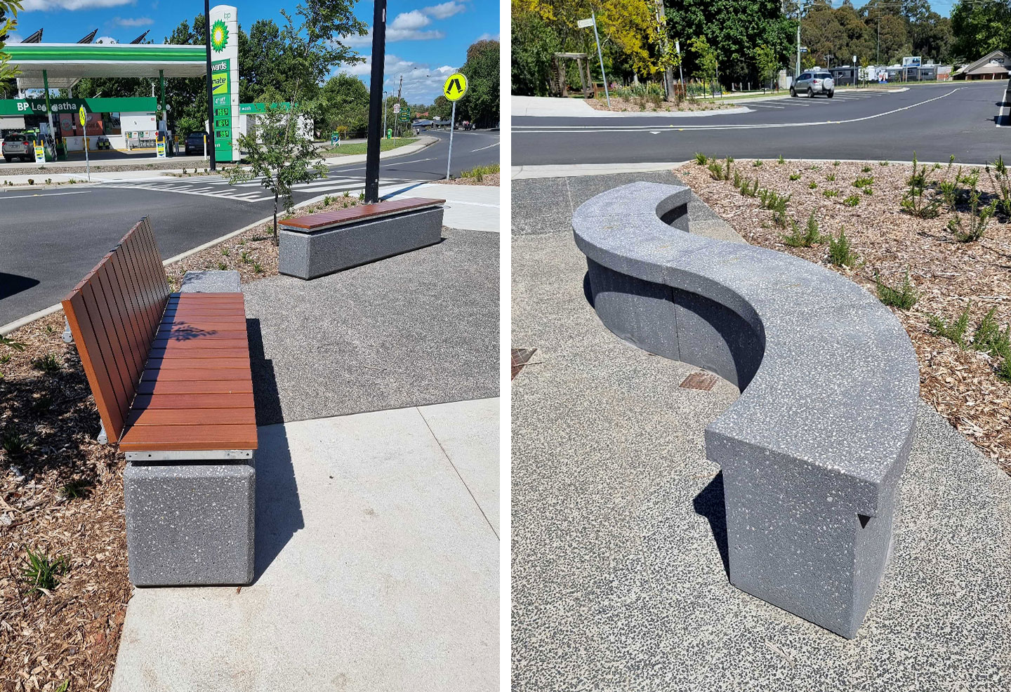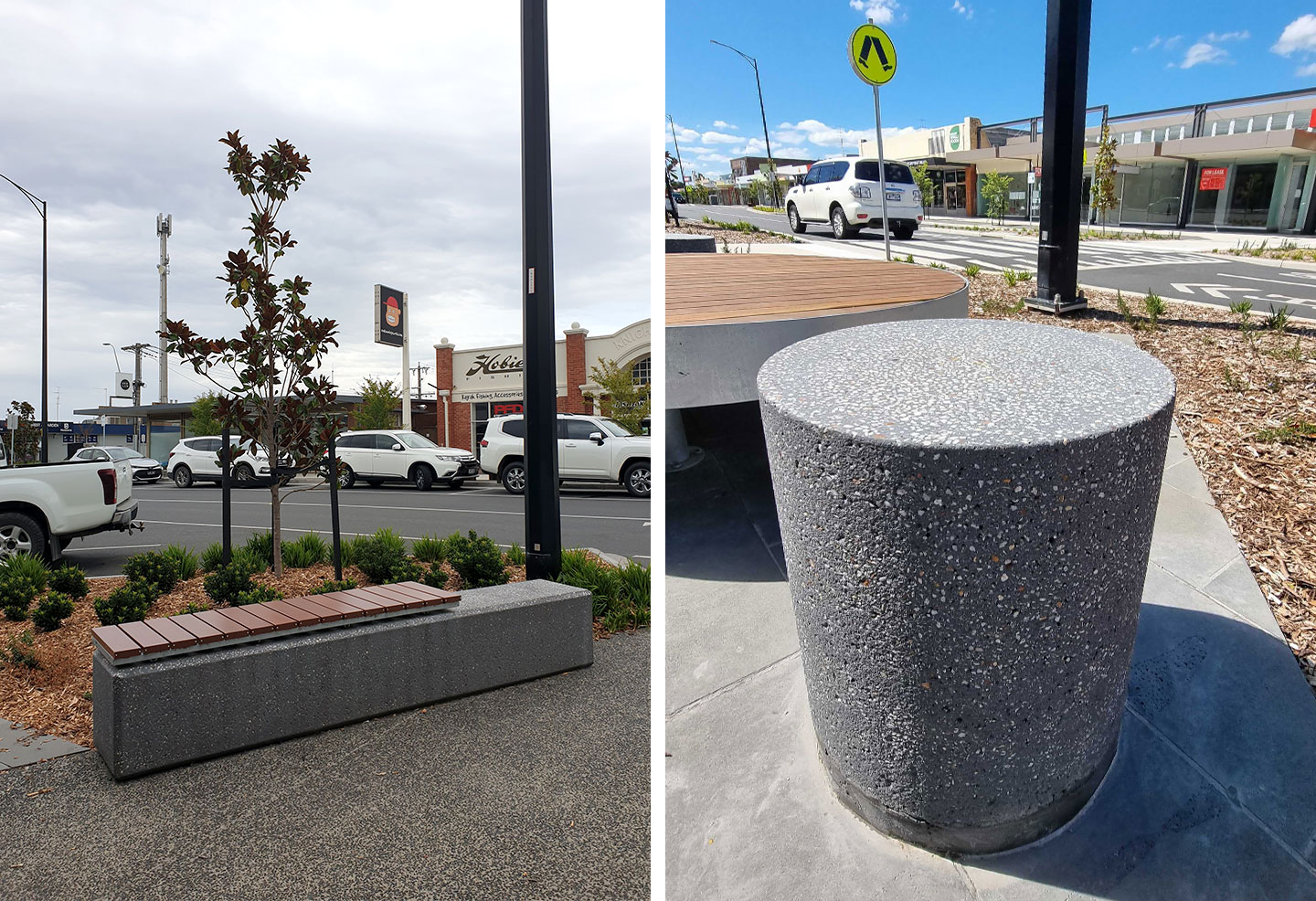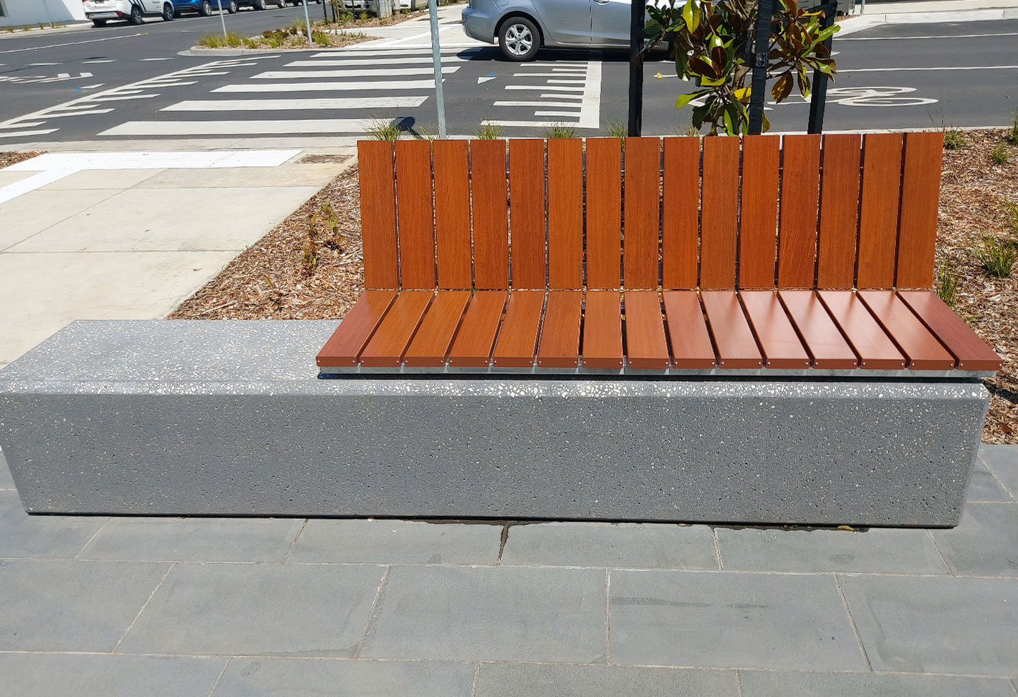 The revitalised streetscape encourages community activity and interaction via a widened footpath and the introduction of various outdoor street furniture elements. This outdoor furniture suite comprises various concrete seat modules from Anston’s catalogue range, customised with timber and steel elements from Draffin and Spark.