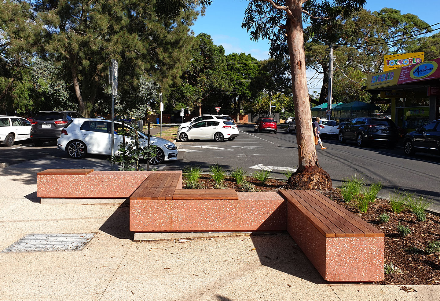 The Bayside City Council’s masterplanned streetscape upgrade of Beaumaris Concourse was brought to fruition in February 2020. With a focus on strengthening the precinct as a vibrant retail and community hub, the upgrade includes new native greenery, slip-resistant pavements, attractive concrete bollards and zig-zagging concrete bench seats that together revitalise and enhance the shared space.