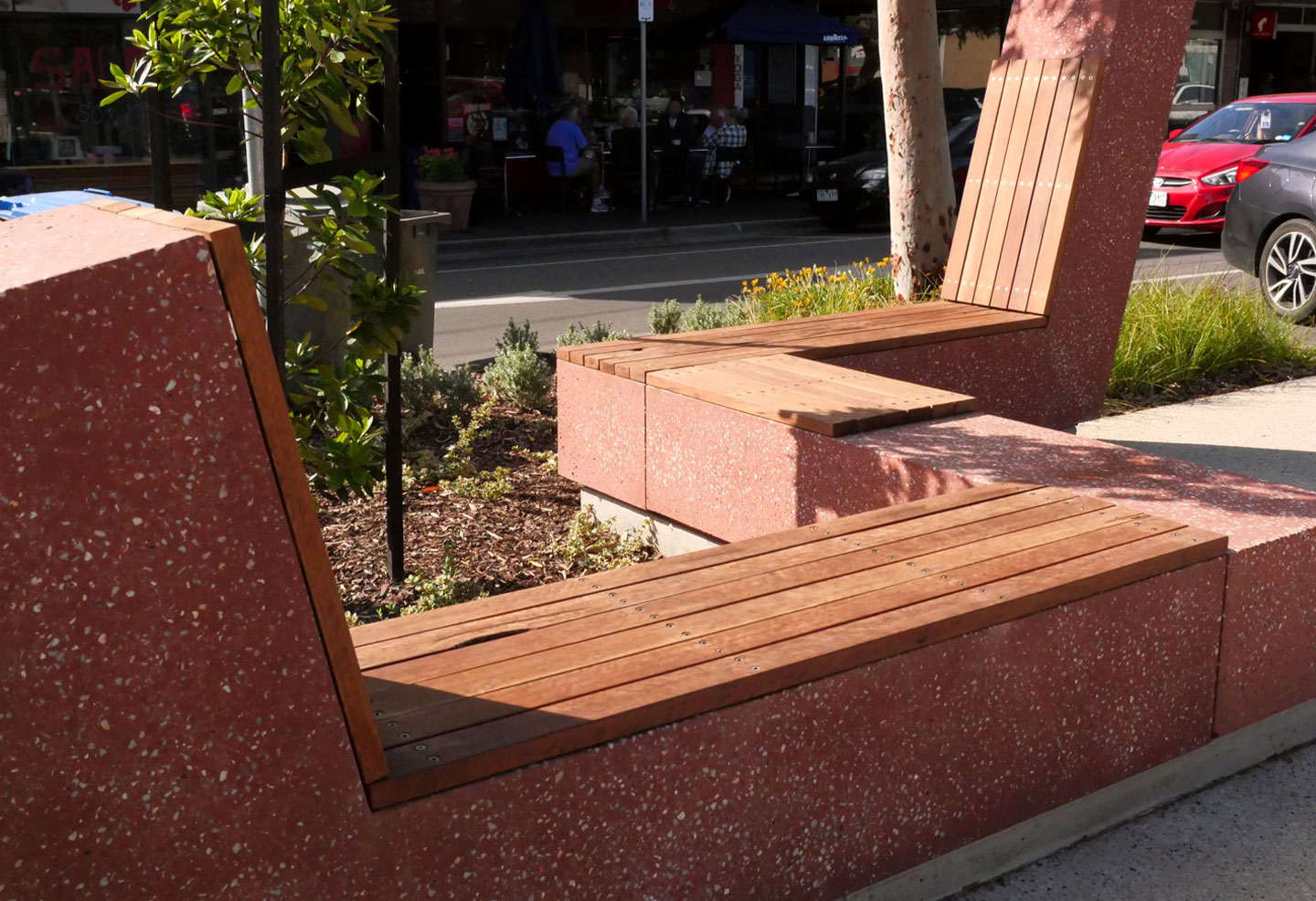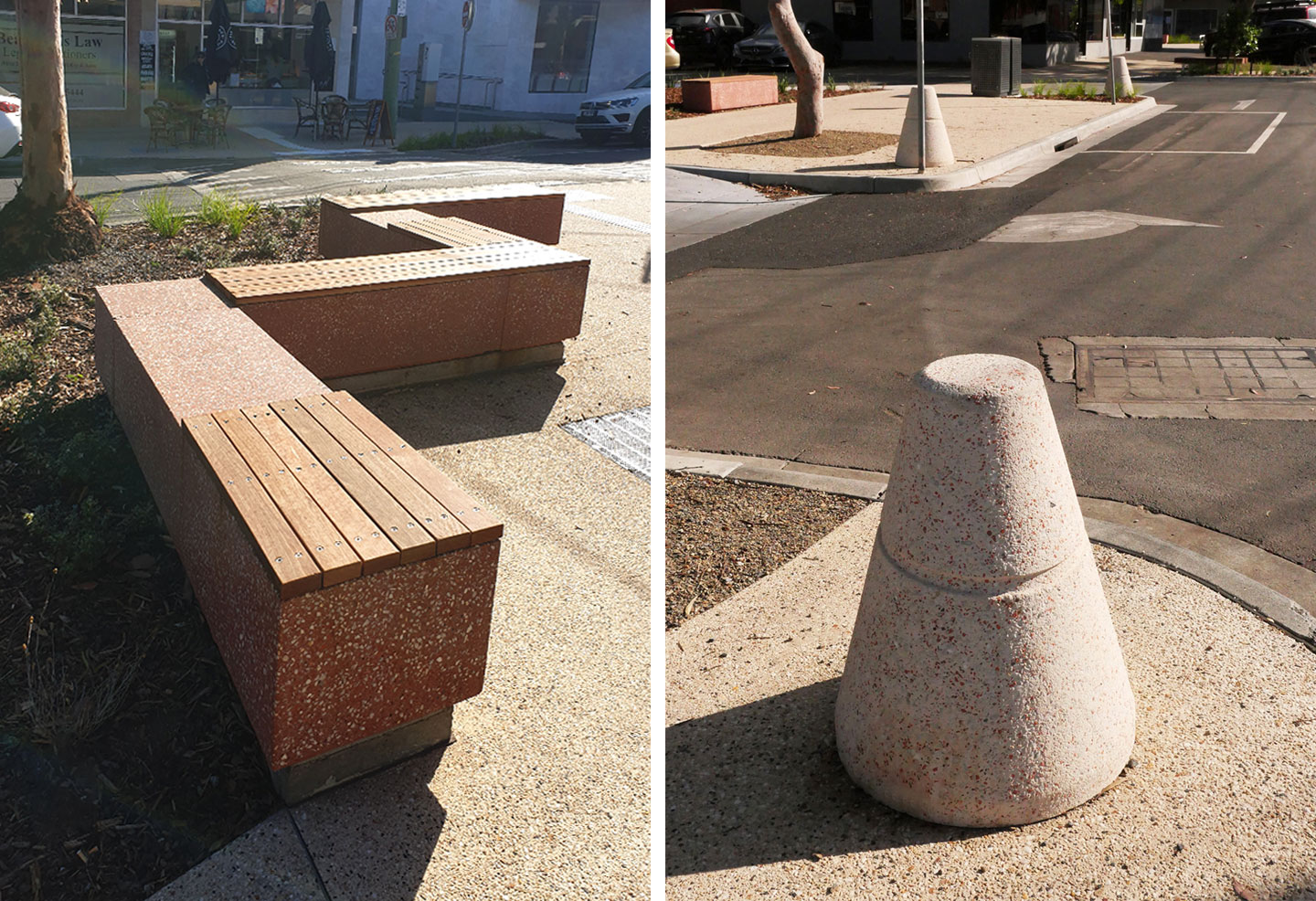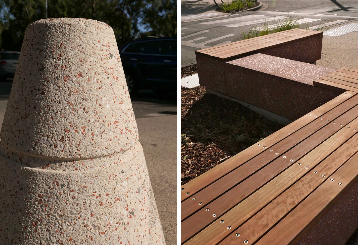 After trialling various concrete mixes with the crushed red brick aggregate, Anston (then SVC Urban) was able to finalise a solution for the sculptural red concrete benches and the conical bollards which have now become key landmarks of the upgraded Beaumaris Concourse.