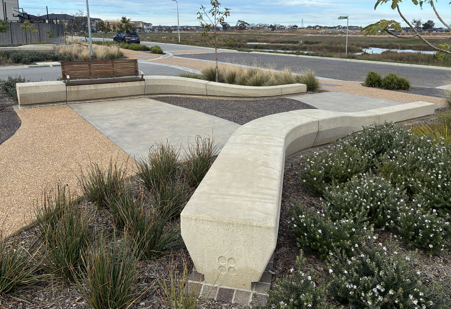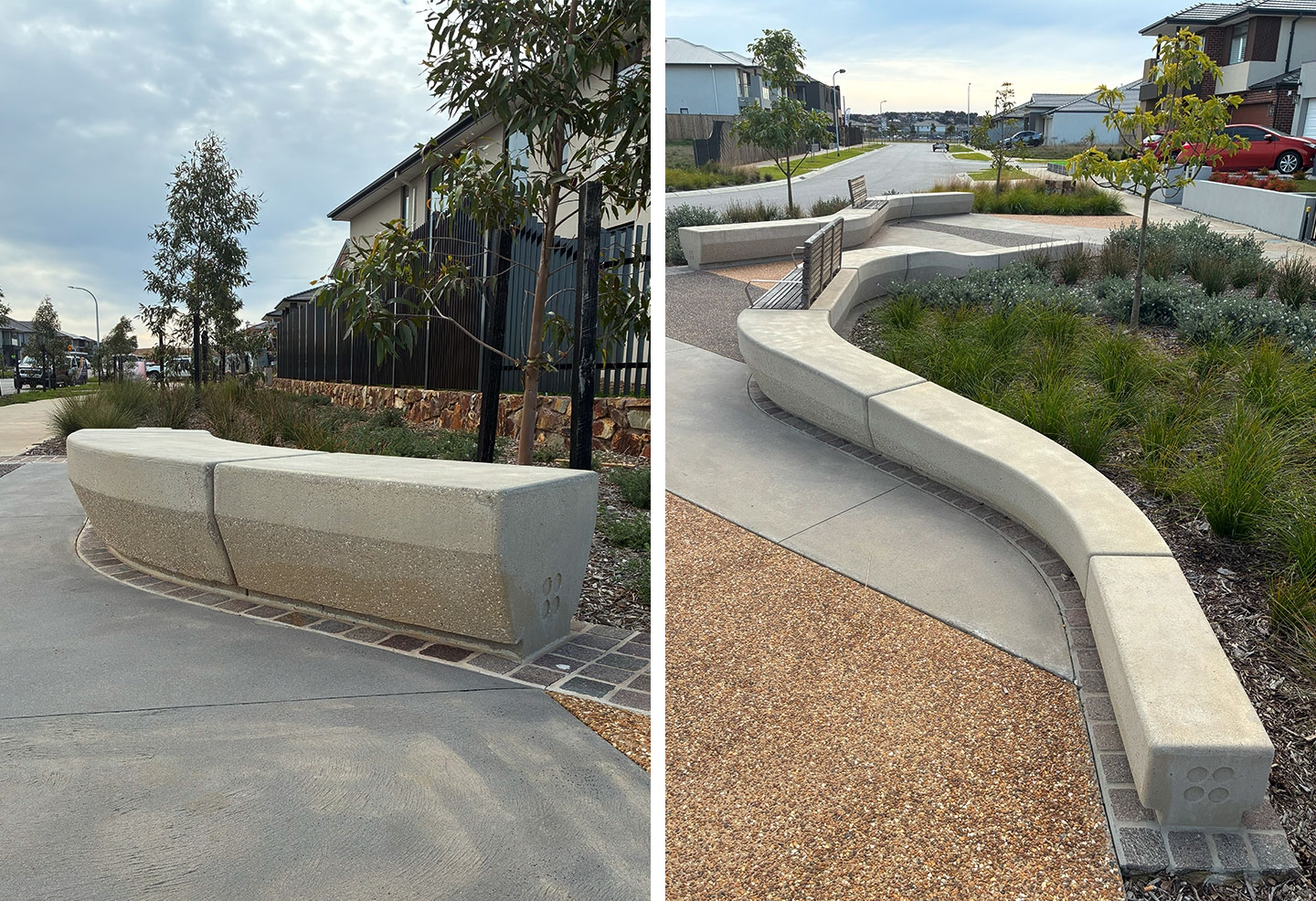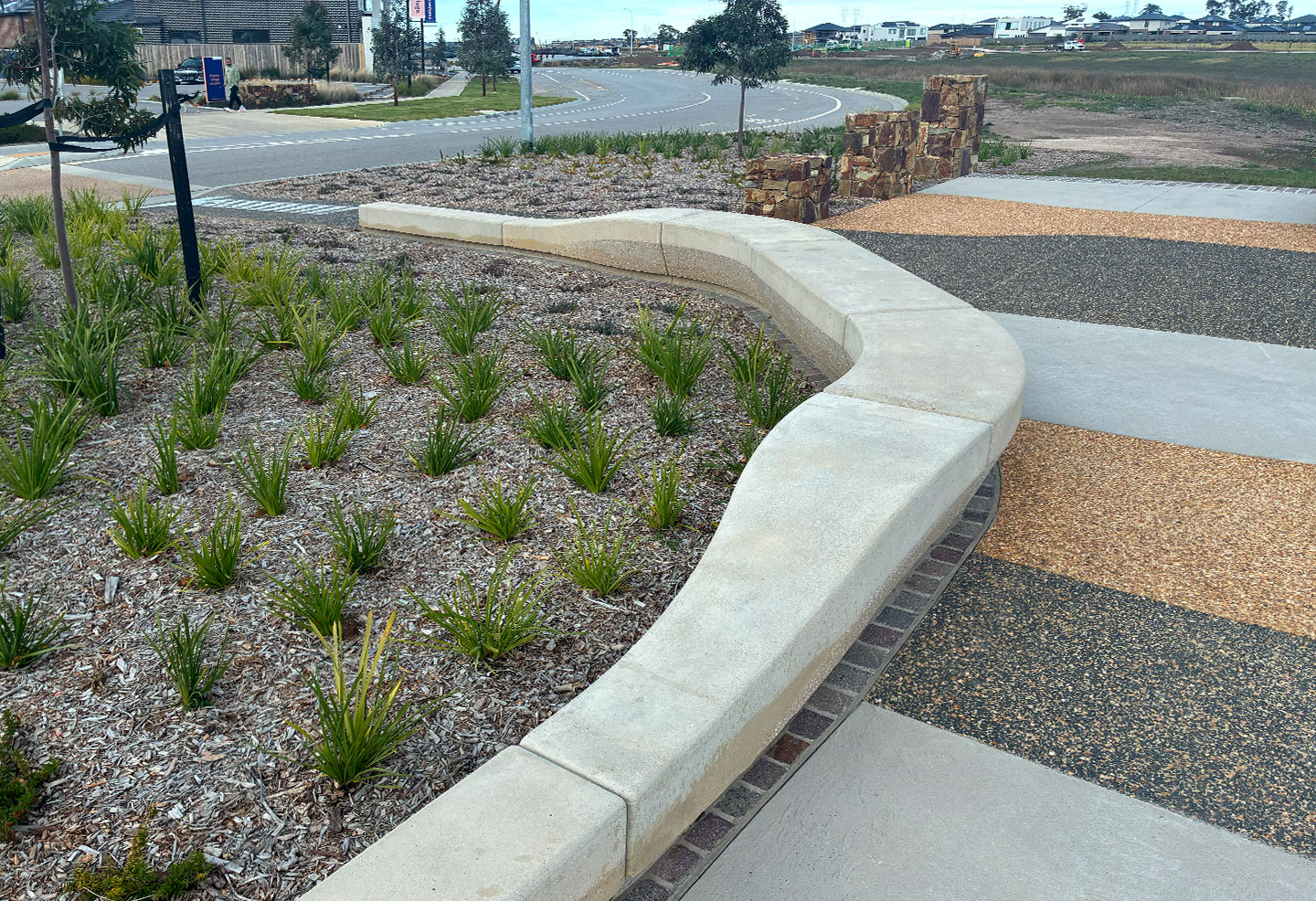 Designed by Tract, a key aspect of the Berwick Waters community is to promote outdoor activity for residents of all ages. Modern outdoor playspaces and 9km of shared bike paths and scenic walking trails weave through the estate, furnished with over 100 custom concrete seating modules that provide areas for rest while contributing to the overall aesthetic value of the landscape.