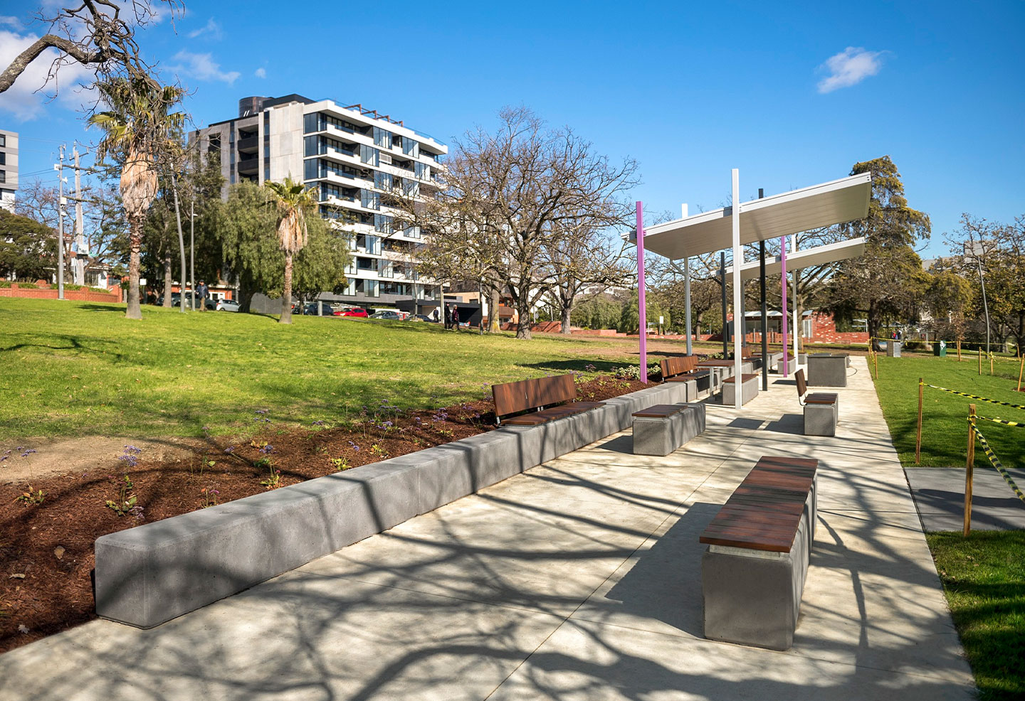 Anston (then SVC Urban) worked with client Planned Constructions to deliver 23 charcoal concrete benches that are a key feature of the central rest area. The benches possess a striking shot-blasted finish, complementing dark timber seat tops installed above.