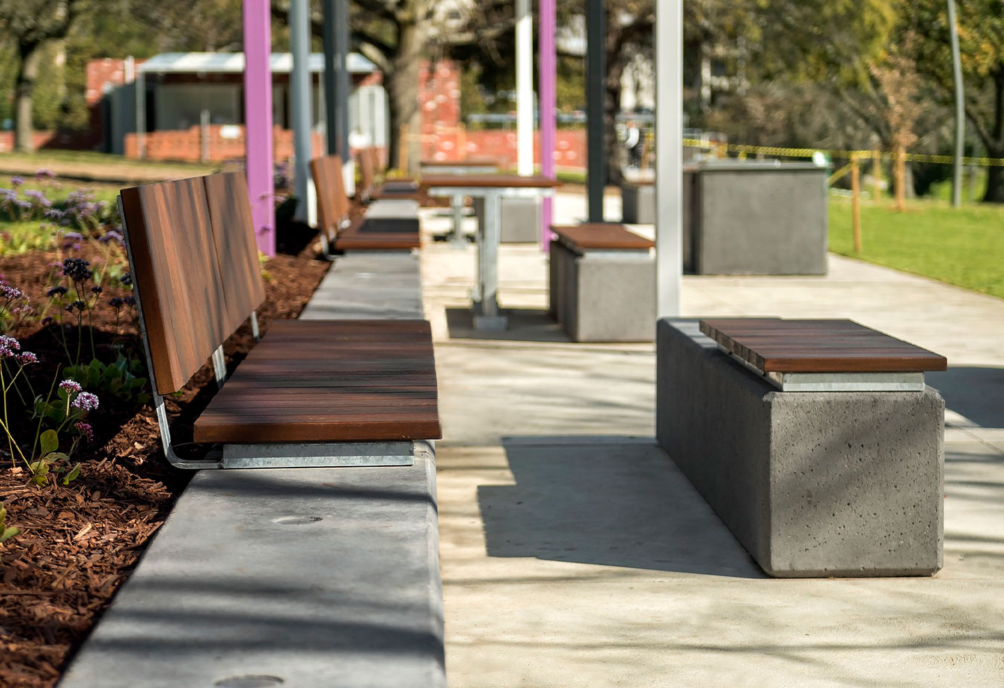 Anston (then SVC Urban) worked with client Planned Constructions to deliver 23 charcoal concrete benches that are a key feature of the central rest area. The benches possess a striking shot-blasted finish, complementing dark timber seat tops installed above.
