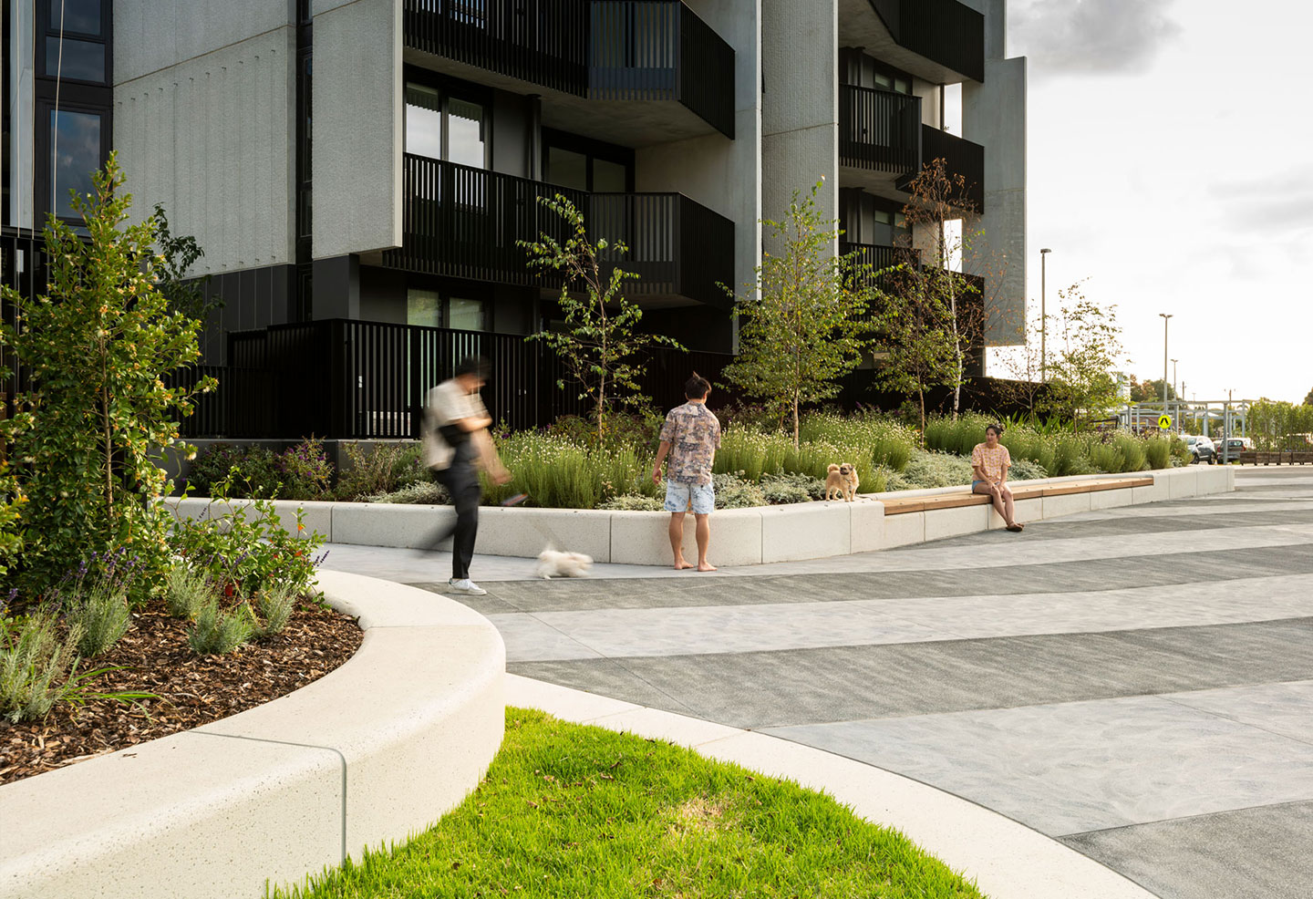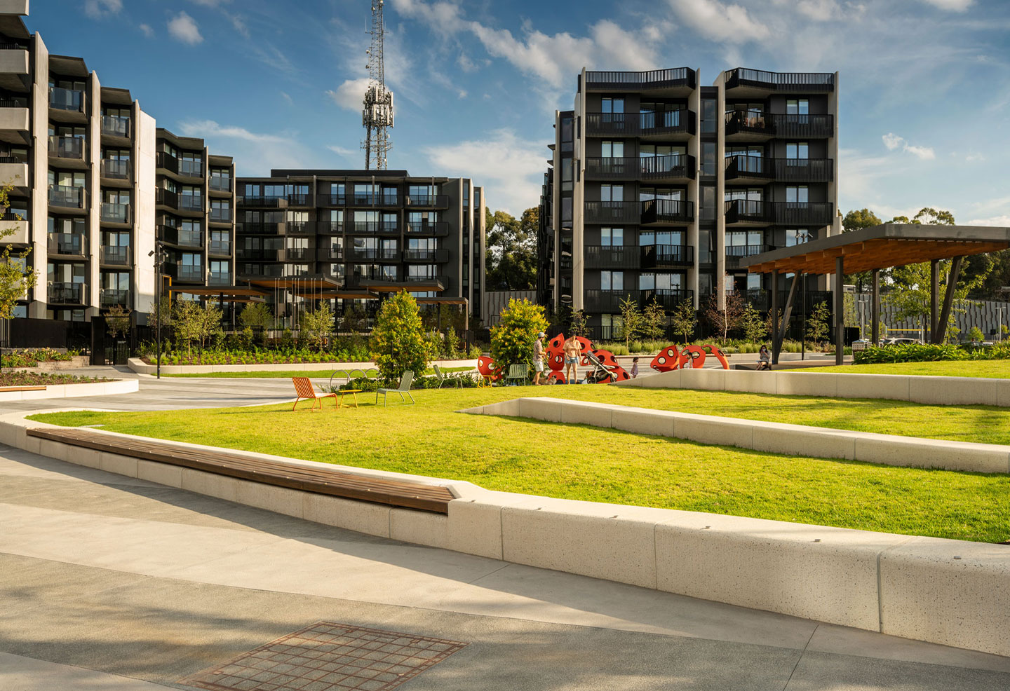 Positioned adjacent to the centre, an expansive Urban Plaza provides ample outdoor seating, cafe dining and designated areas for rest and play. Sweeping around these open spaces are organic concrete seating modules produced by Anston (then SVC Urban), which undulate through the landscape and create boundaries for garden beds, lush lawns and recreational play areas.