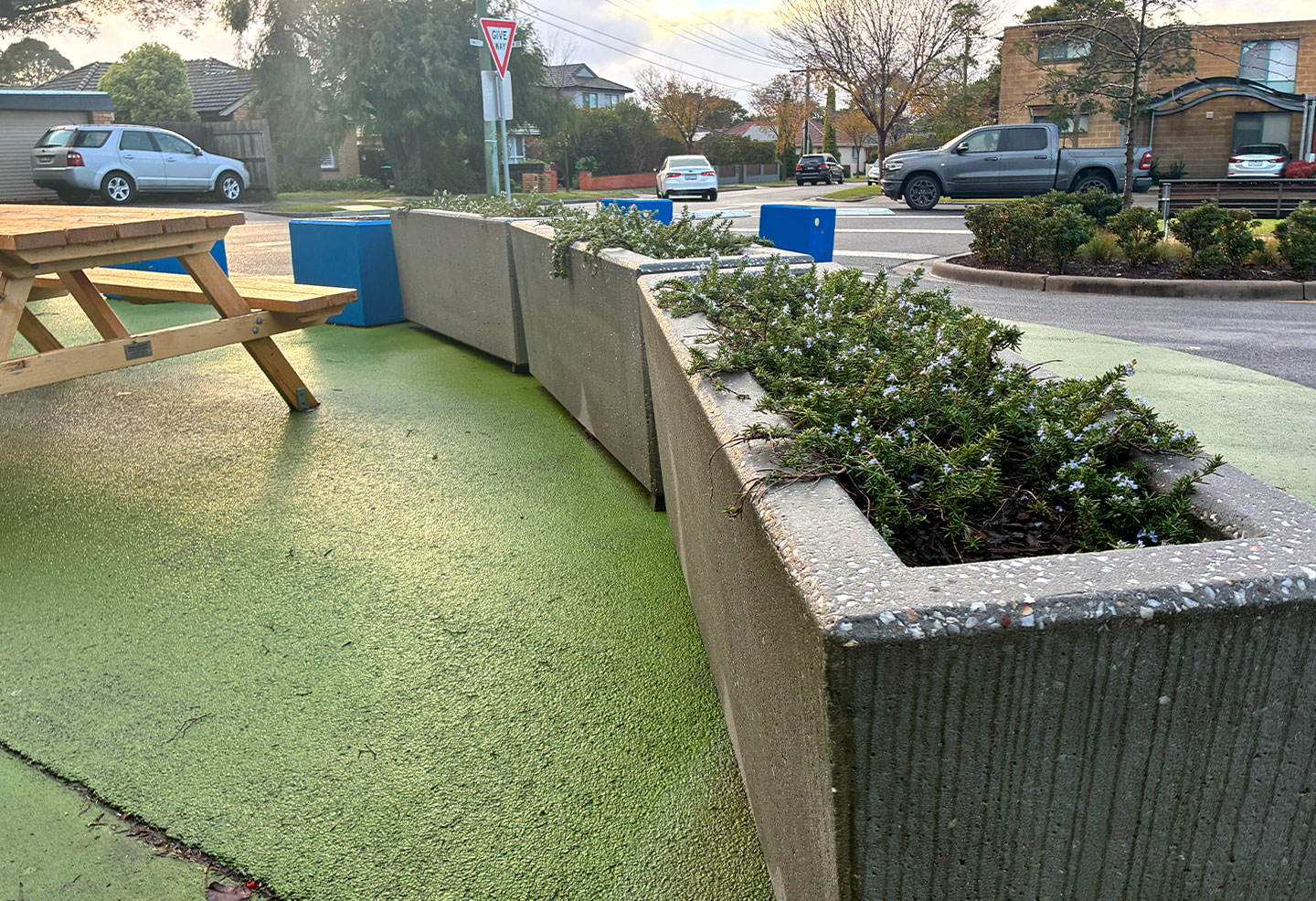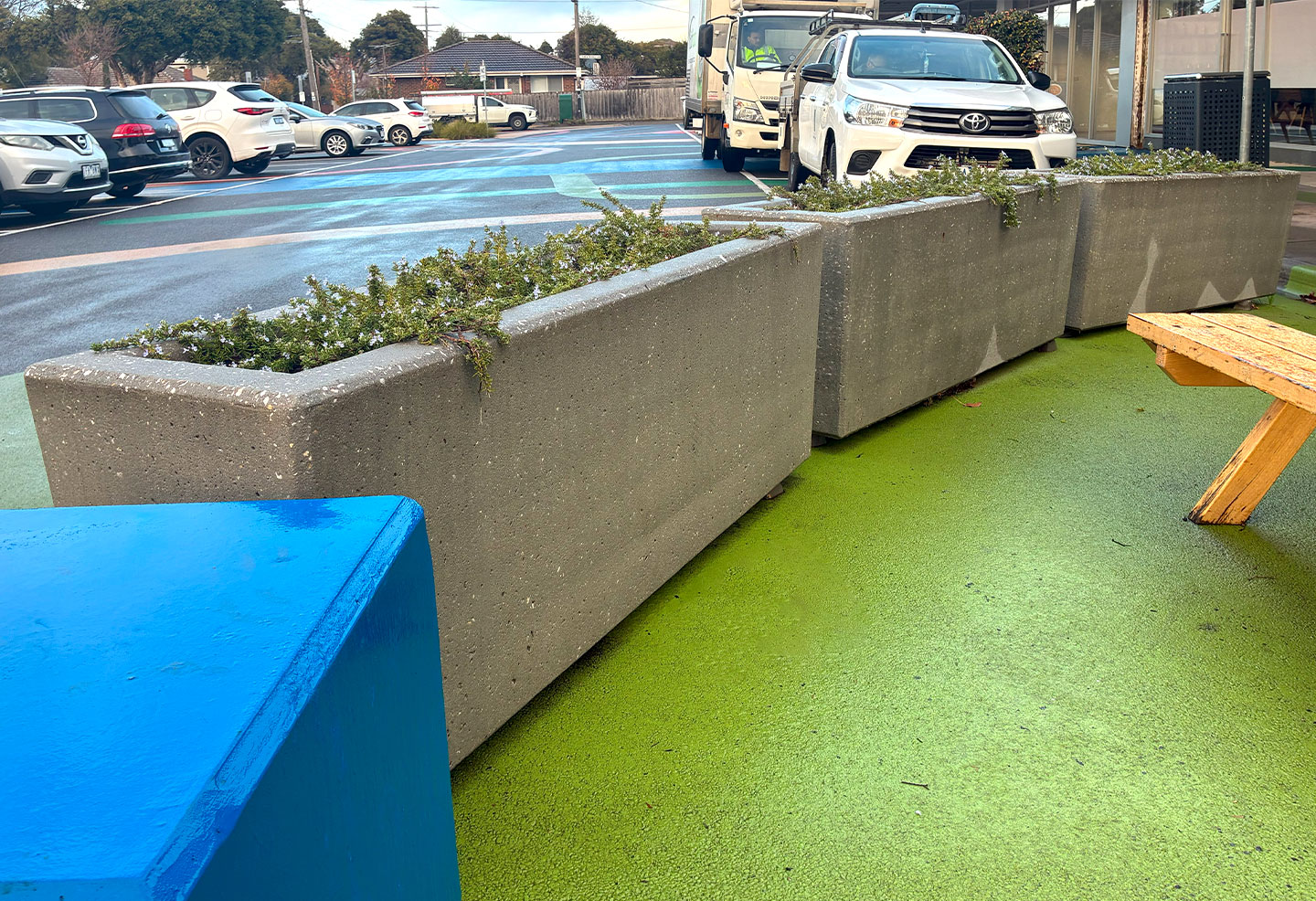 As part of the precinct upgrade, Anston (then SVC Urban) was contracted to supply a series of concrete planters to form up a protected pedestrian area on the road surface, effectively extending the footprint of the on-site eateries. Installed alongside concrete blocks, these robust concrete elements create a functional and visually appealing physical boundary for the space.