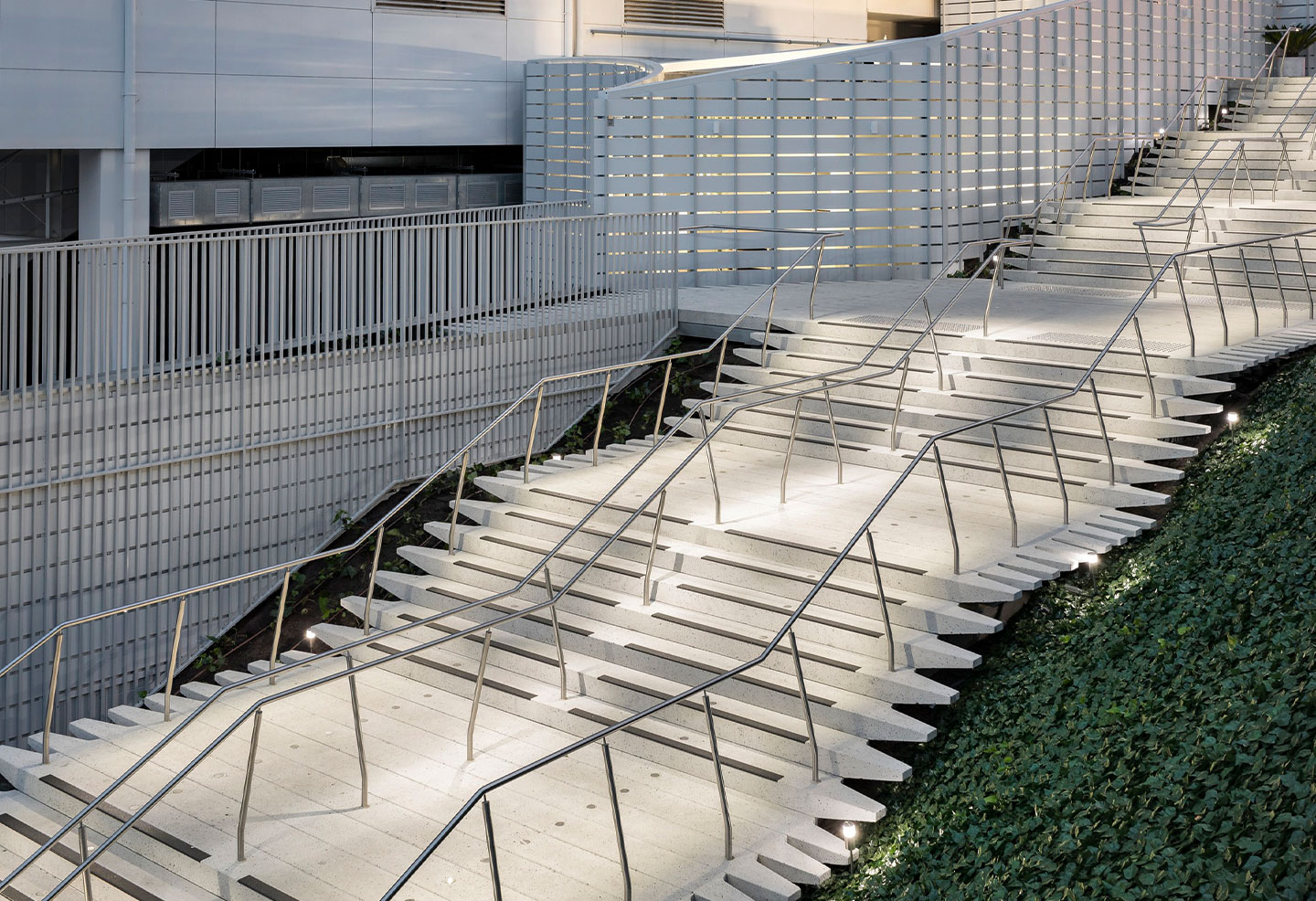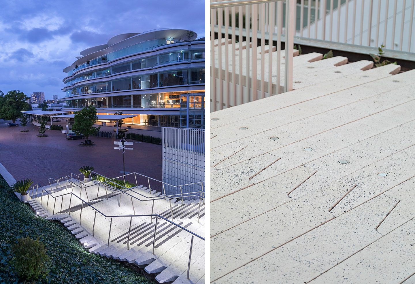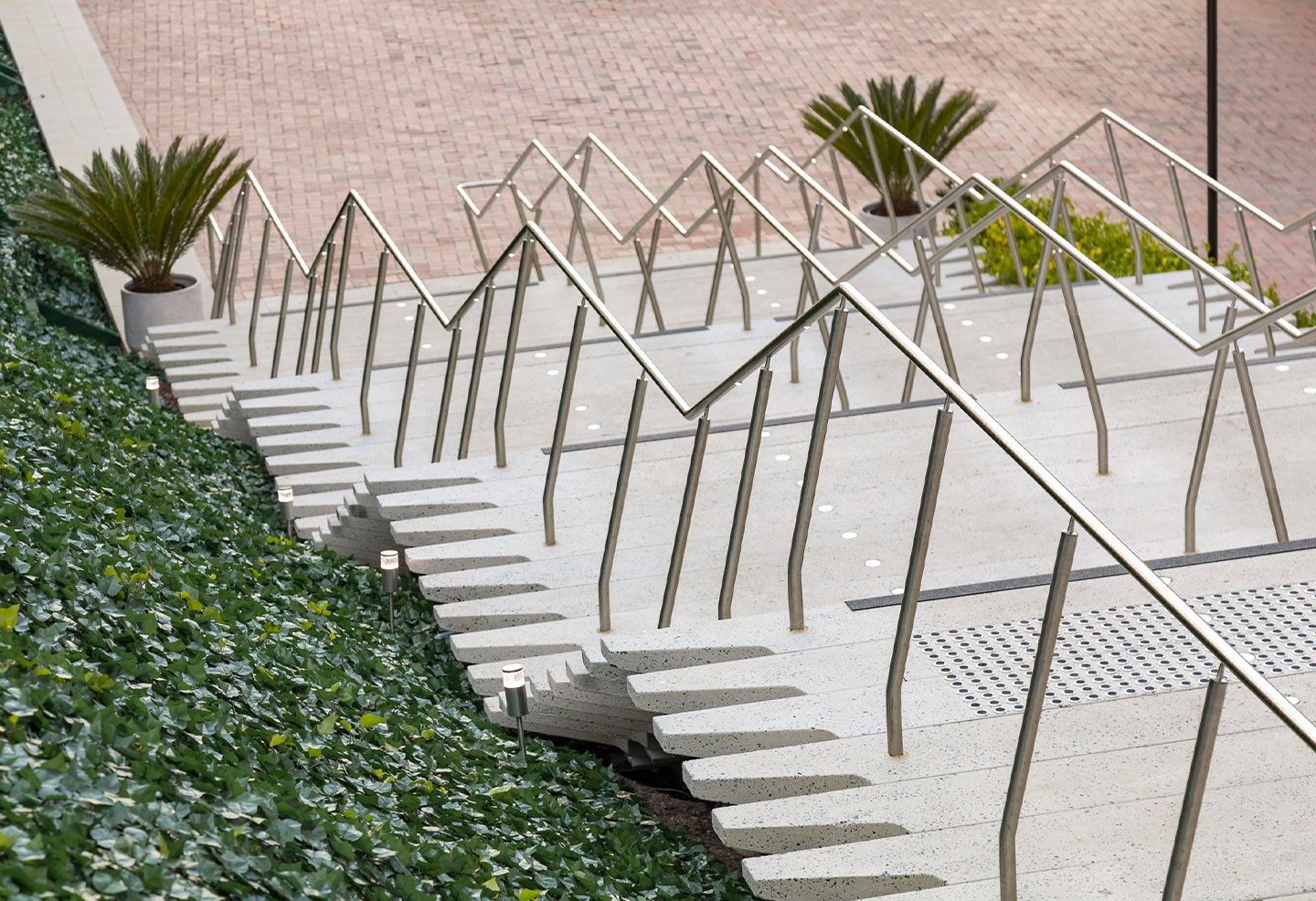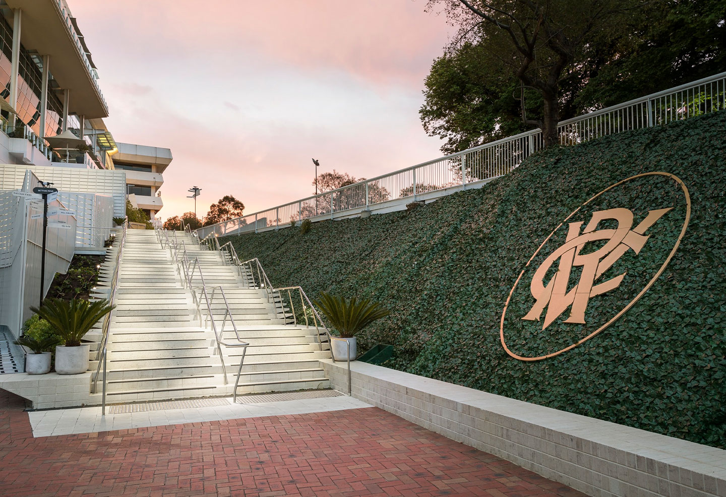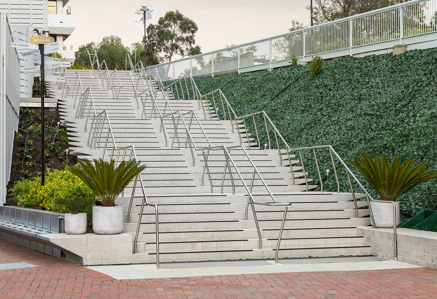 The Colours Stairway offers improved accessibility into the racecourse, creating a pathway for pedestrian transition from the train station down into the betting ring. Demonstrating architectural beauty and construction excellence, the 5.6-metre wide terraced stairway is constructed from bespoke concrete stair treads, locally produced by Anston (then SVC Urban). The stair treads feature a tapering cantilevered edge on each side, creating an eye-catching sawtooth design.