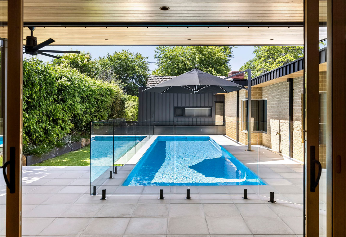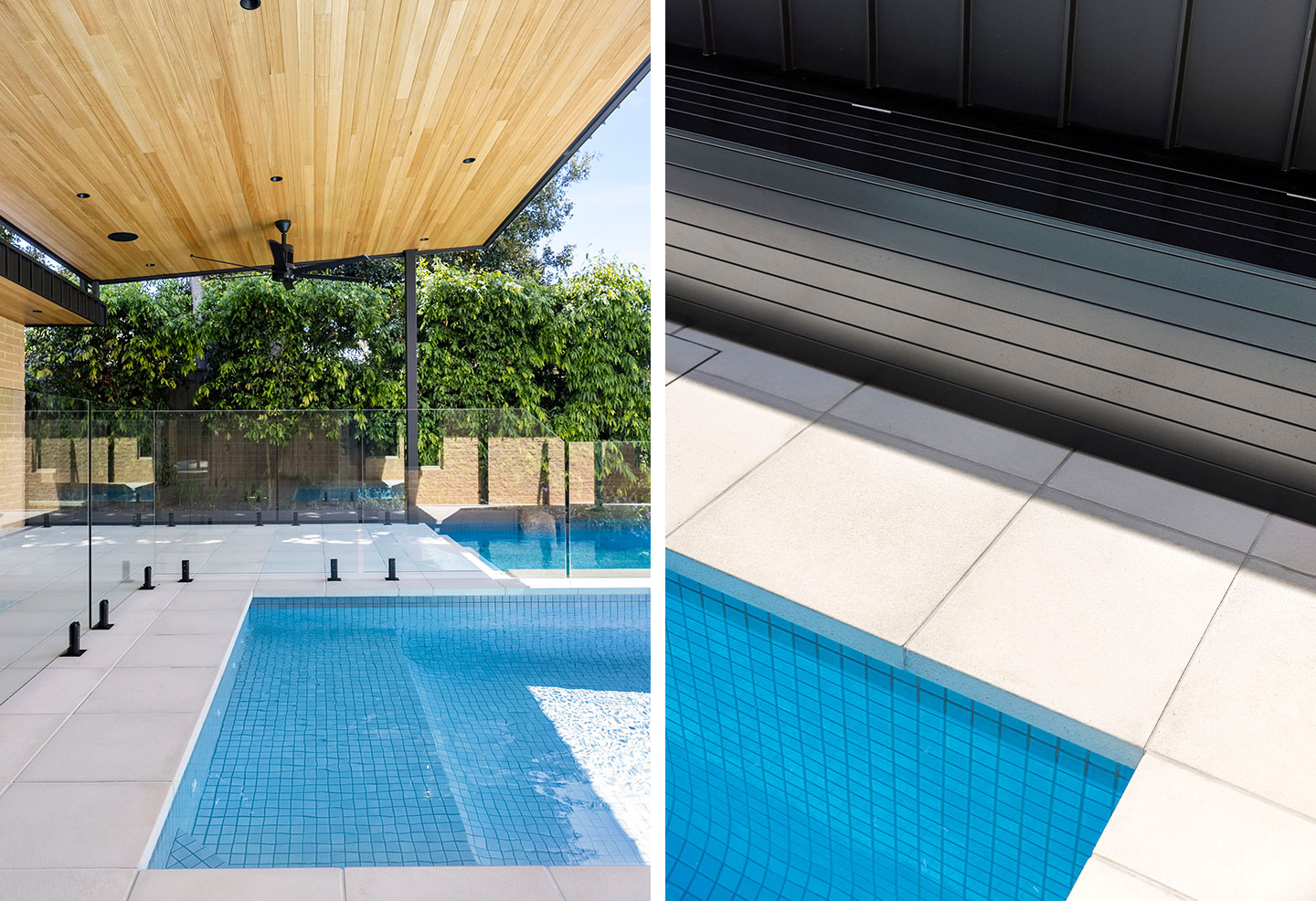 Joining the architectural palette of warm natural brickwork, timber slatted ceiling, sleek glass fencing and black architectural detailing, the Bondi paving and pool coping acts as a unifying element in the space, creating balance and structural clarity. Am impressive example of outdoor living done right, this Glen Iris residence beautifully showcases the versatility and elegance of Anston’s architectural concrete paving products.
