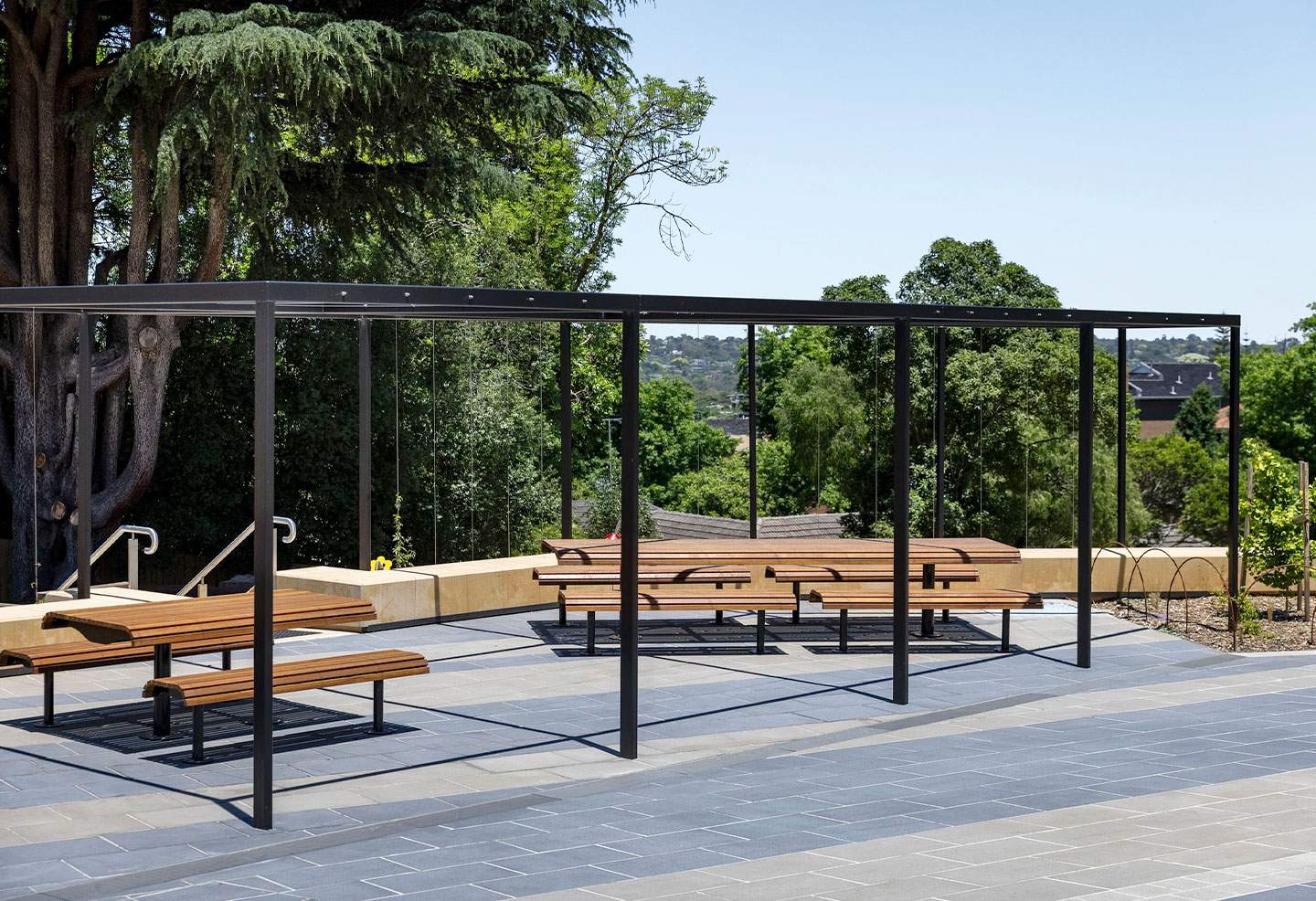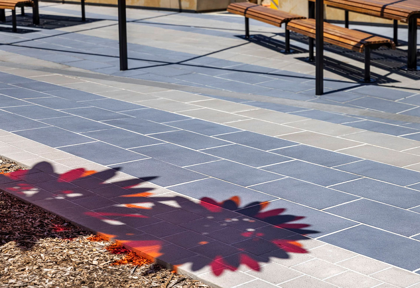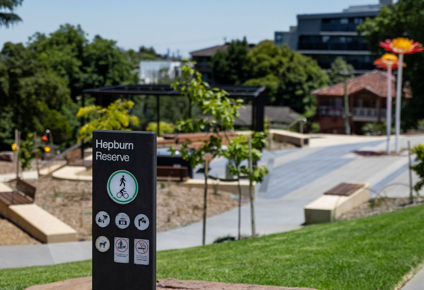 Offering various amenities for leisure and recreation, Hepburn Reserve is the perfect space for play or relaxation. Park facilities include ample outdoor seating and a BBQ area situated on a robust, attractive pavement of banded Anston pavers, featuring a trio of colours in Indi, Riviera and Mimosa. Other park features include drinking fountains, public art, large open lawn areas and a play space.