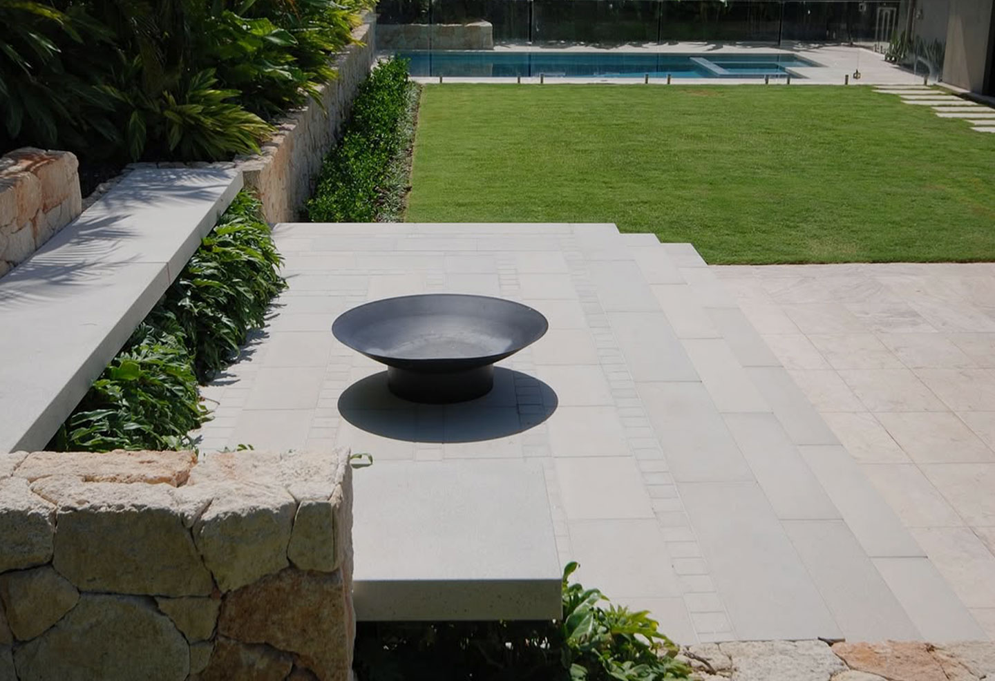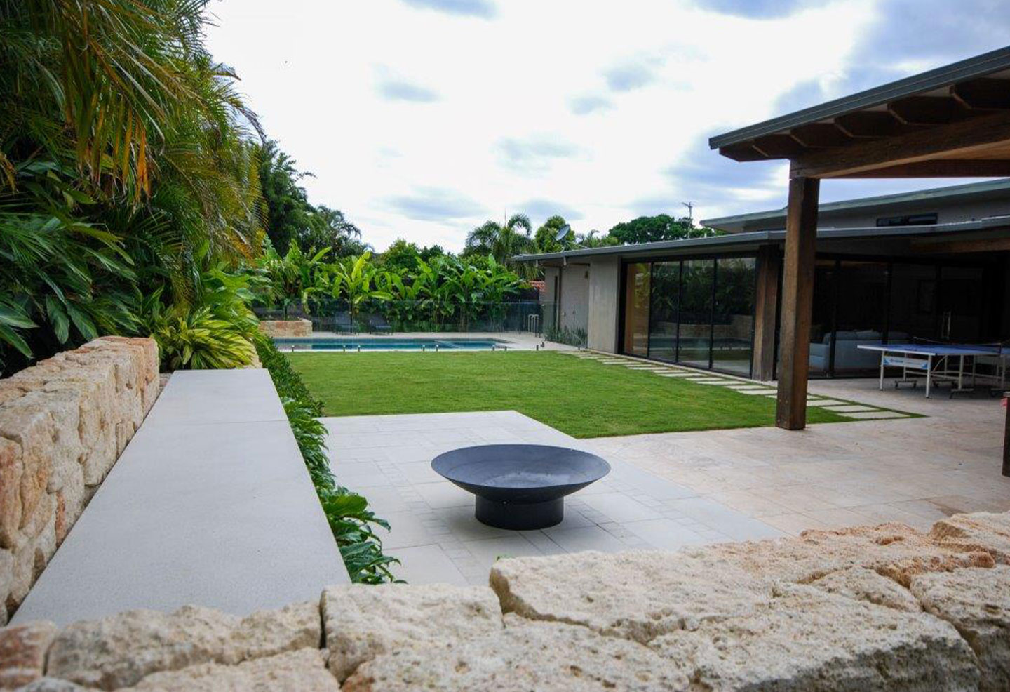Another prominent feature of the upgraded landscape is the elevated fire pit area, which provides open-air seating adjacent to the existing alfresco. Raised three steps above ground level, this area is the centrepiece of the garden, constructed with Remi feature pavers and carefully assembled limestone cladding to match the rock wall. Around the fire pit, a large L-shaped bench seat (also in the colour Remi) floats over a dense bed of philodendron xanadu, offering the perfect spot for socialising outdoors.