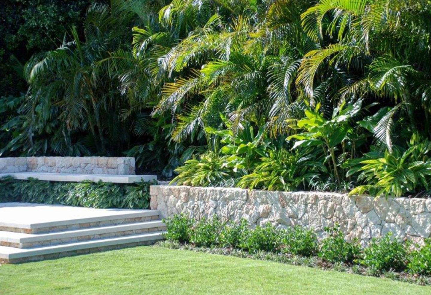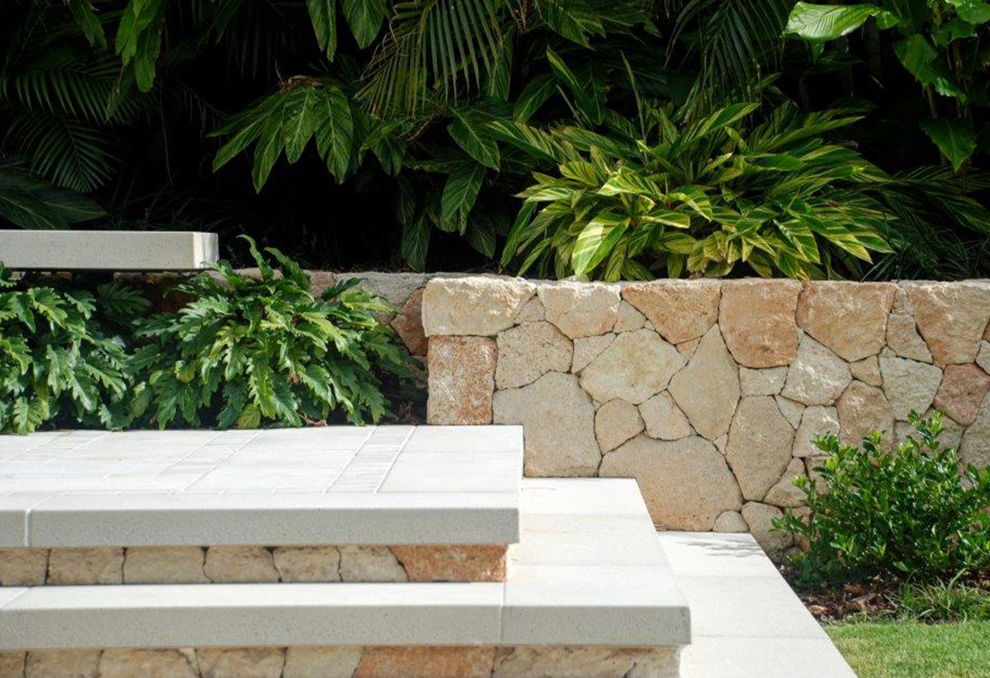 Wrapping around the pool’s northern boundary and continuing westward along the perimeter of the grassy lawn, a limestone feature wall provides a striking visual element that seamlessly links the separate garden spaces together.