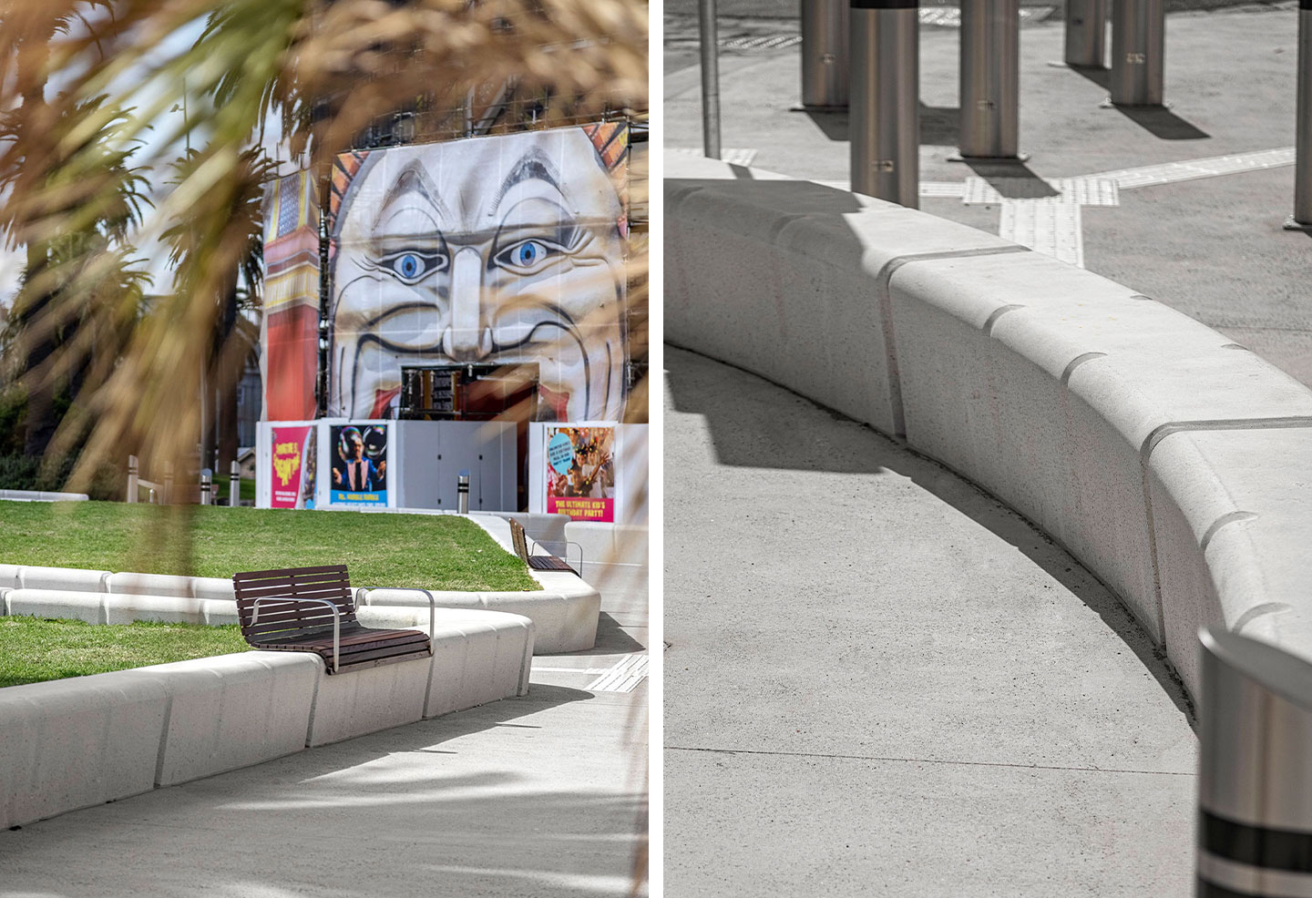 The bespoke modular seats follow a unique but consistent design theme, with a combination of straight and curved units installed strategically in various configurations around the plaza to maximise space and enhance pedestrian flow. Serving both functional and aesthetic purposes, the durable concrete seats offer visitors ample resting spots, encouraging longer visits and increased community interaction in the upgraded precinct.