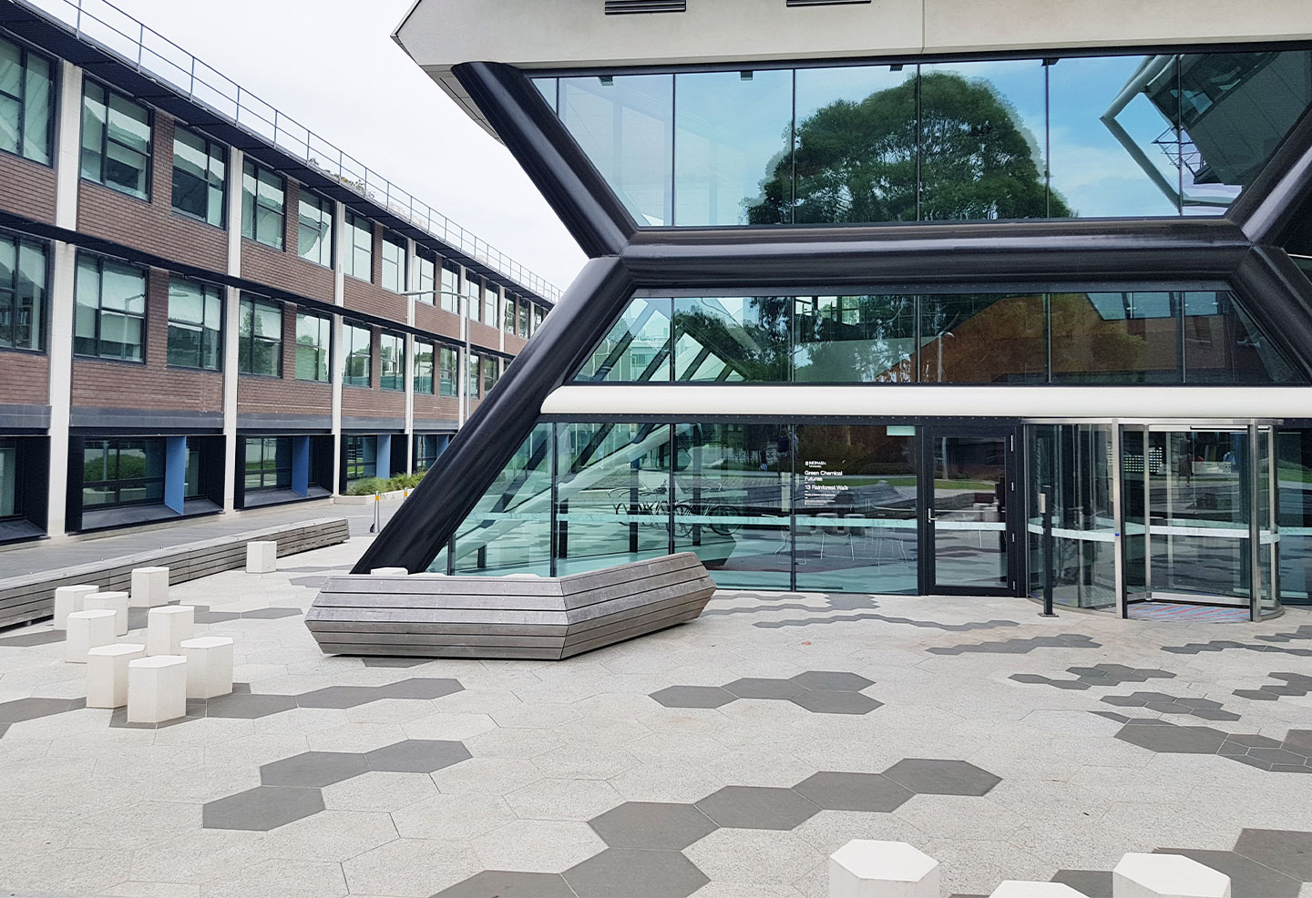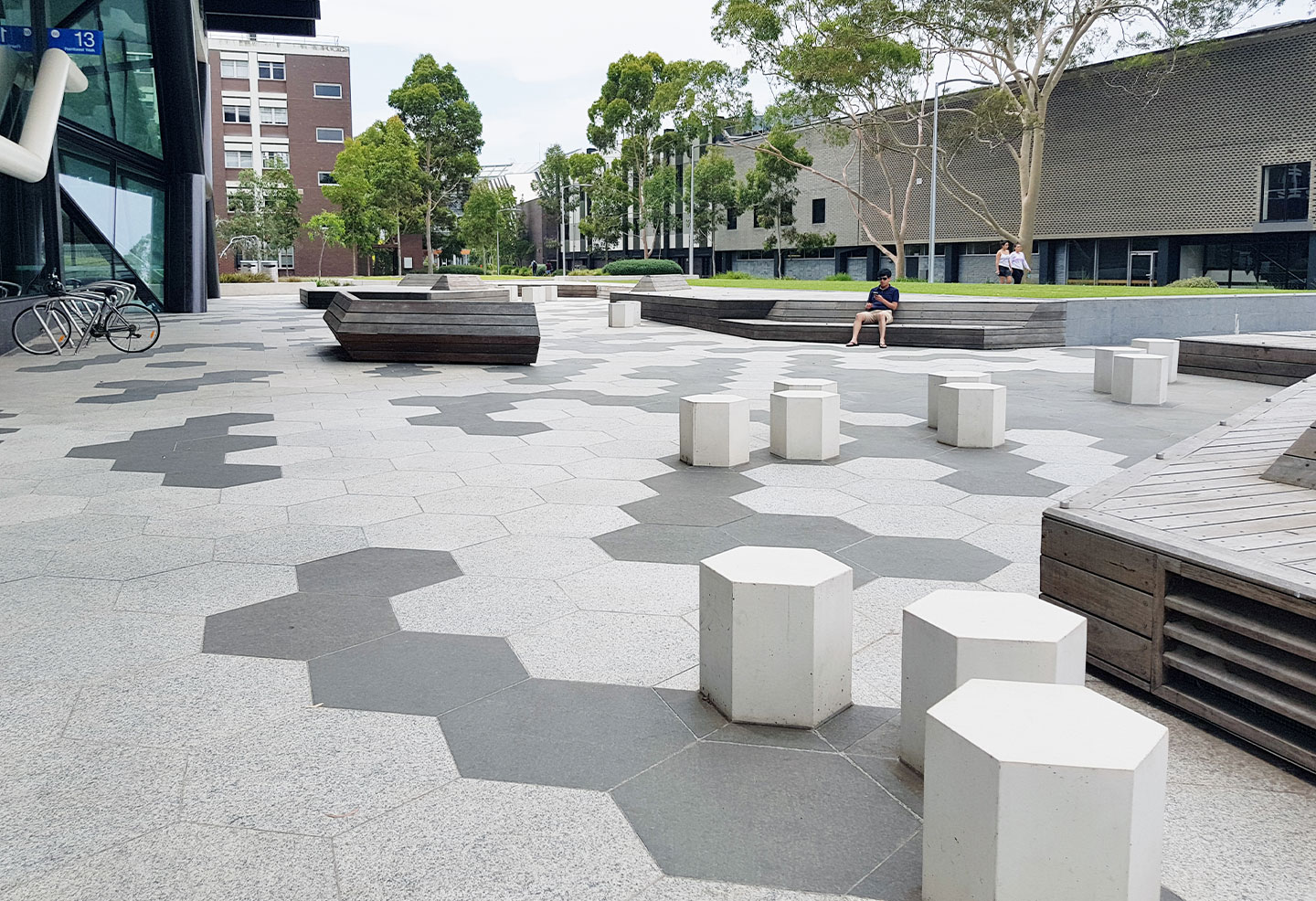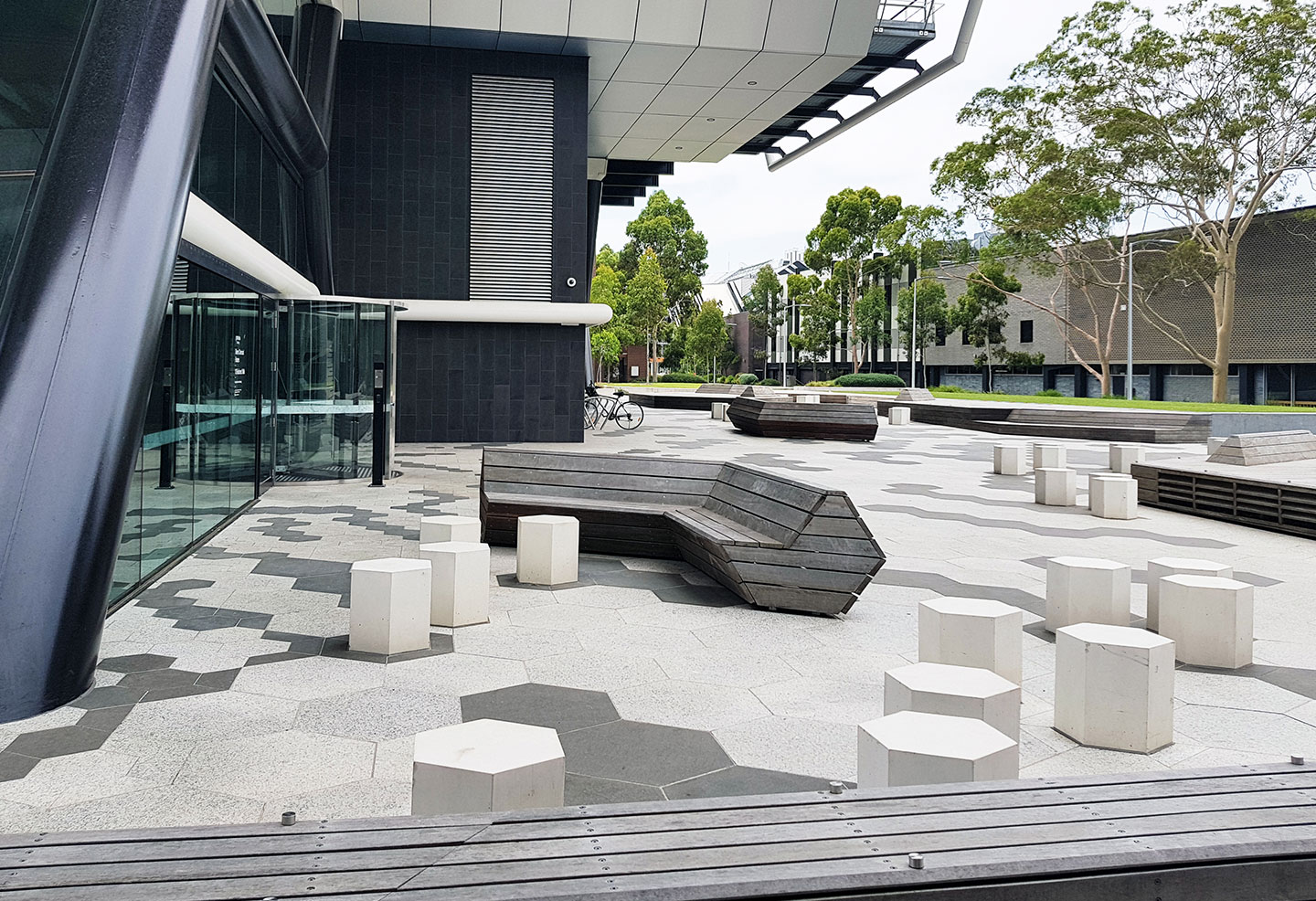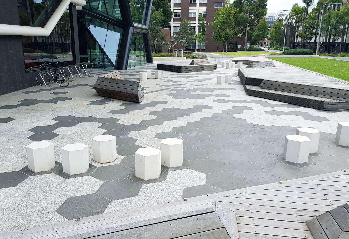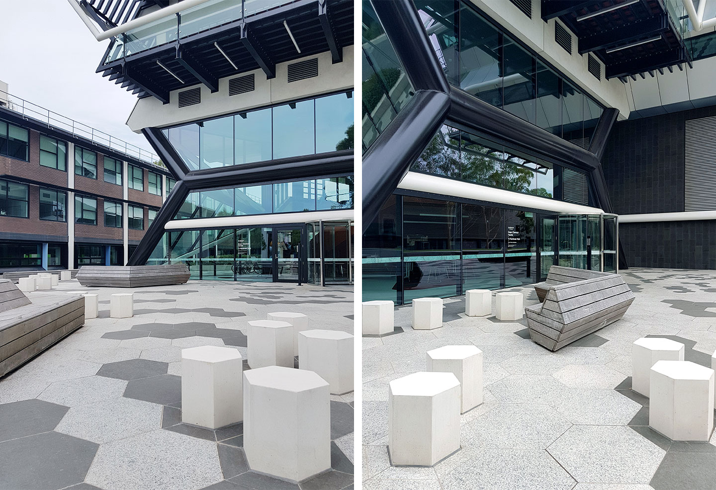 Located in the heart of the Science precinct is Lyons Architects’ award-winning Greener Chemical Futures building, which features a large courtyard that spills out onto the public campus square. Geometric timber benches and creamy white Hex concrete seats provide a variety of spaces for group and individual seating. The hexagonal paving in the courtyard complements the hex seats, drawing a connection to the sharp lines and geometry of the building itself.
