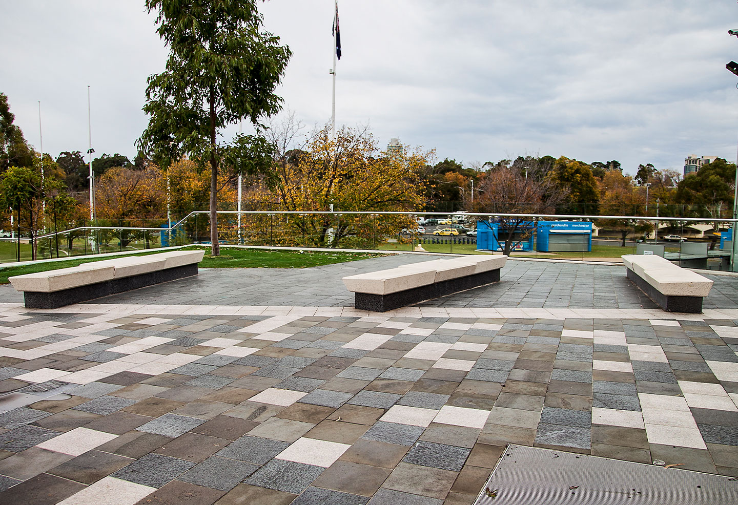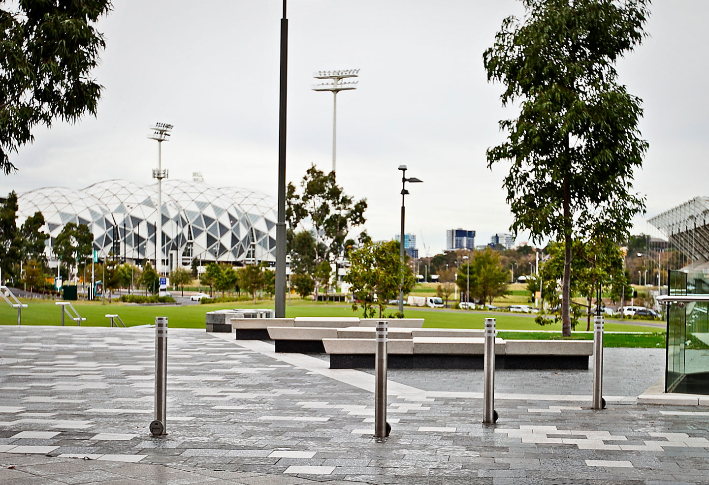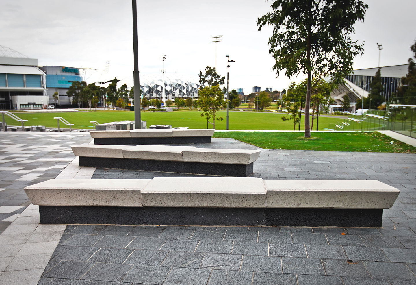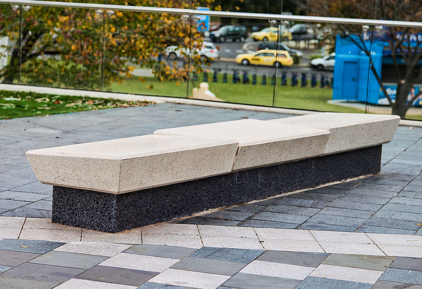 Outside the Tennis Centre, geometric concrete benches, produced in a custom design by SVC-Anston, adorn the forecourt, providing ample seating for visitors to the arena. The seats feature bright white seat tops in a three-part tilting design, resting atop dark charcoal plinth bases.