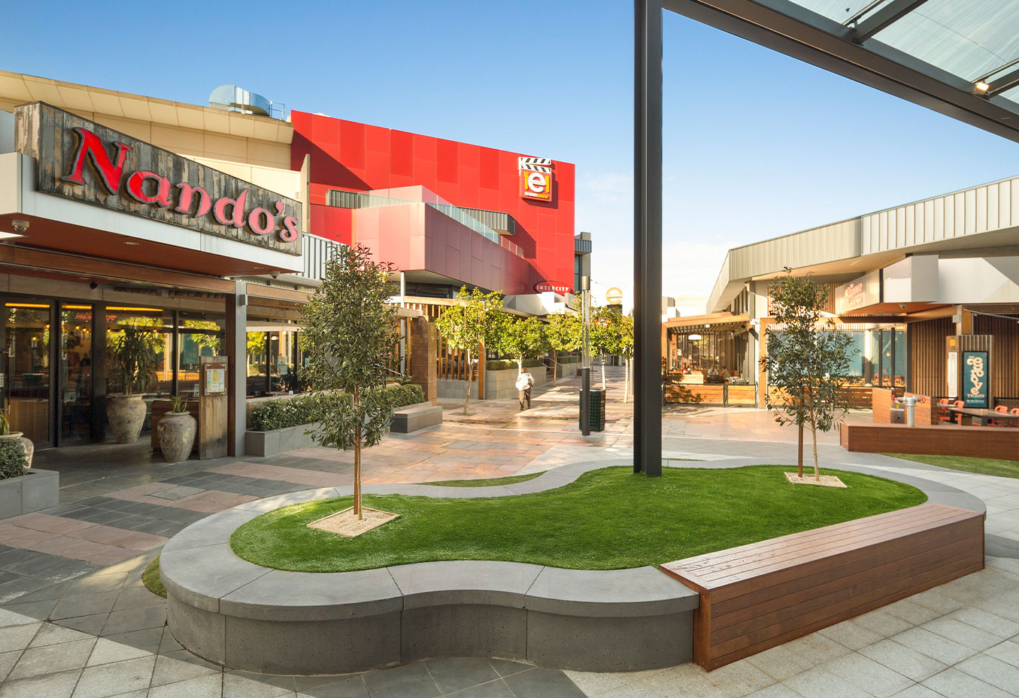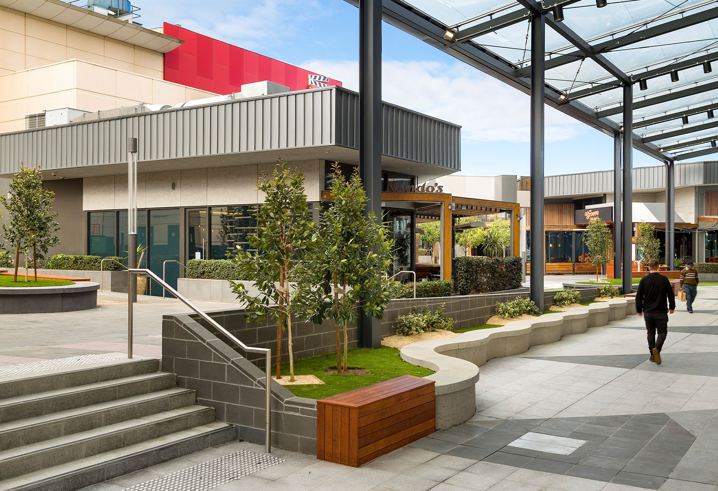 Adjacent to the Pacific Epping retail and dining precinct, the 96-room apartment hotel includes a new dining precinct at ground level. This area is bordered by several concrete seat modules, used in a range of configurations to create interesting rippling and meandering curves.