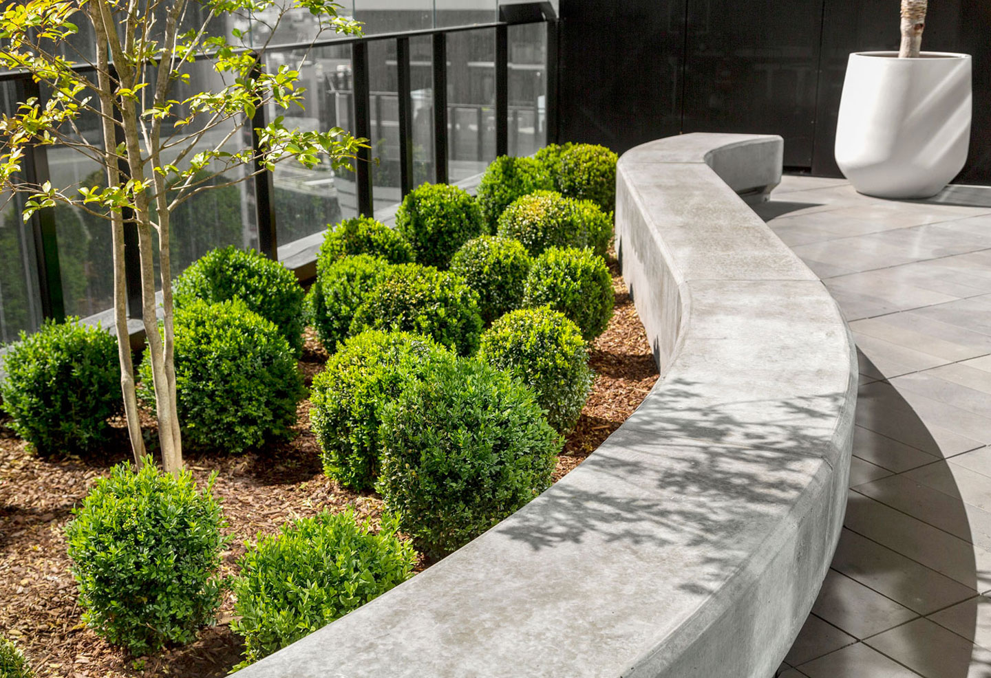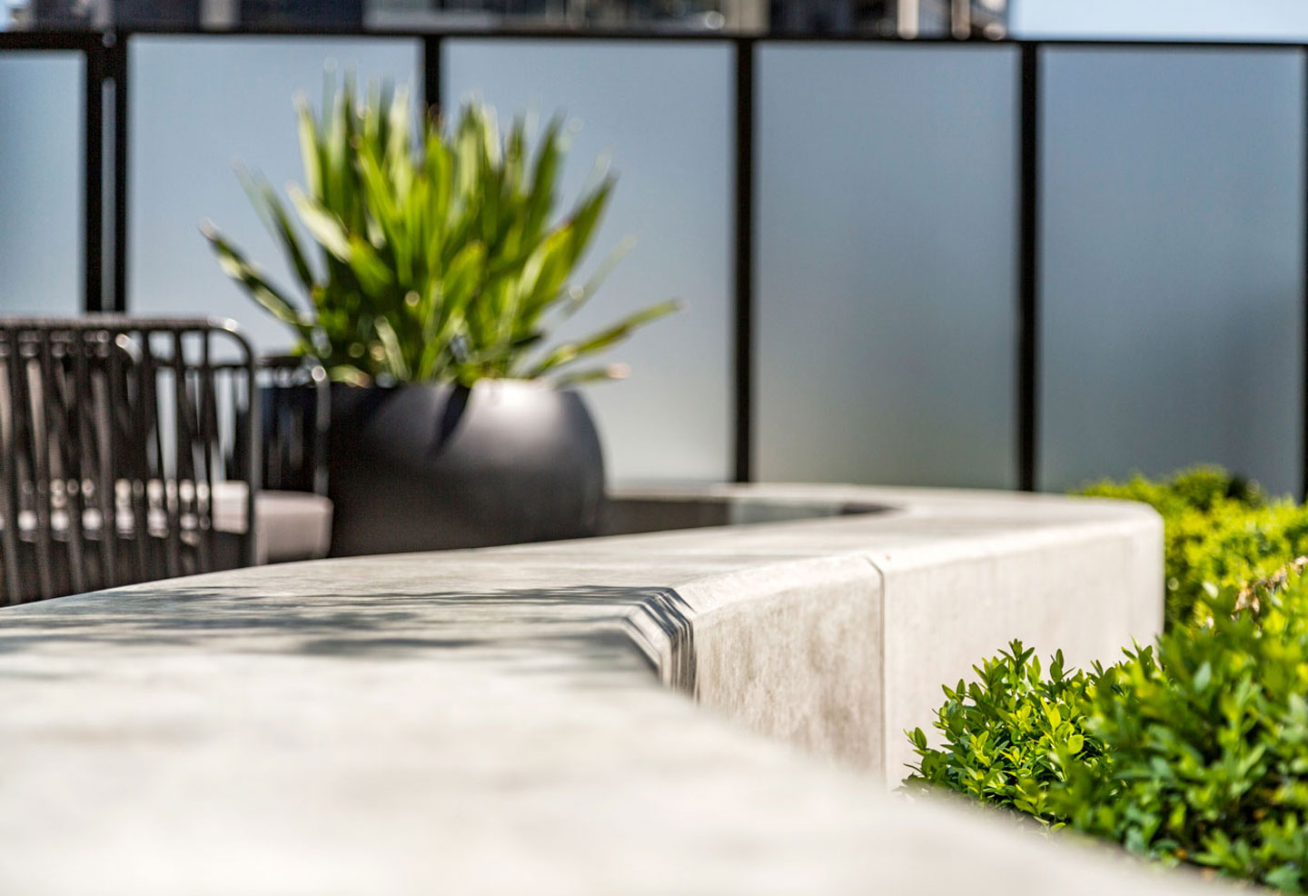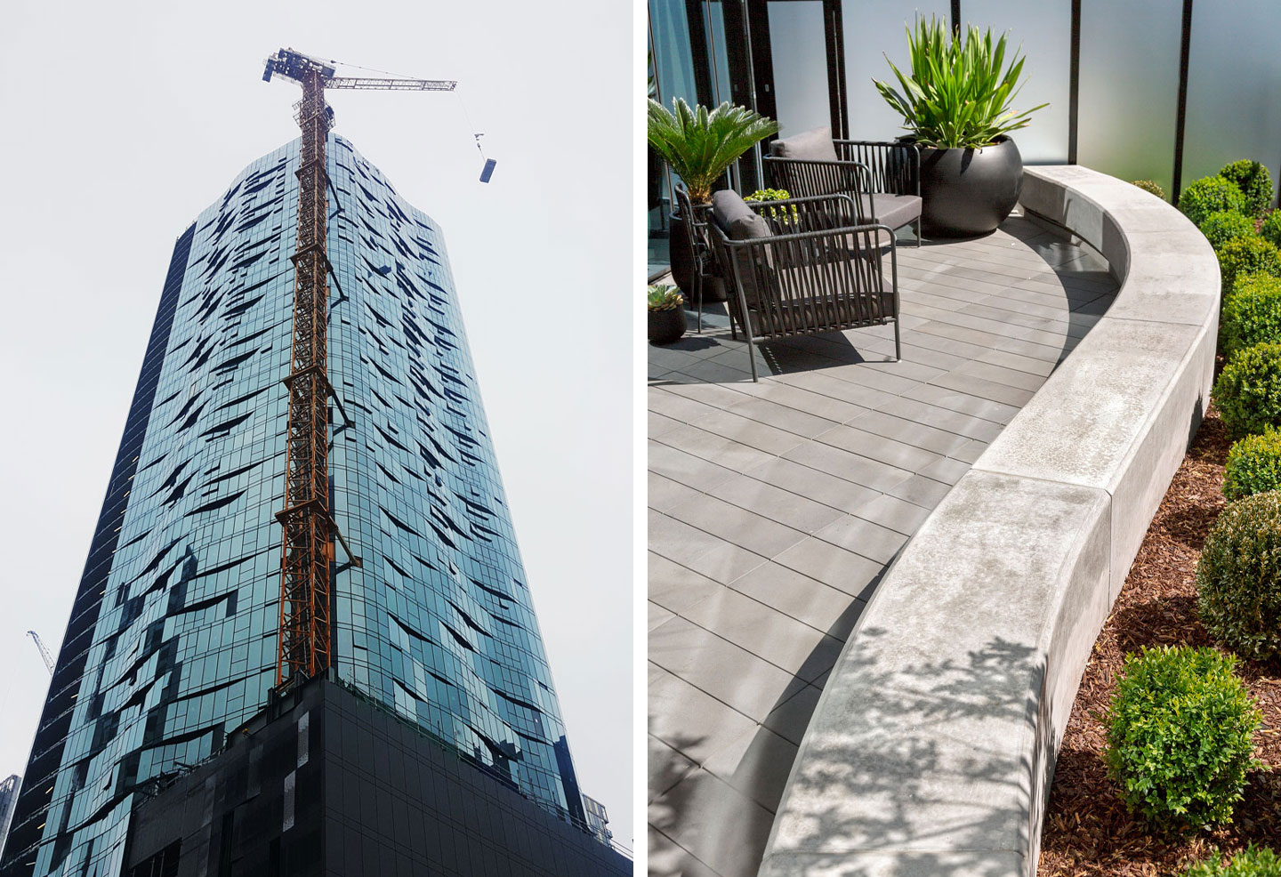 Anston (then SVC Urban) supplied multiple custom concrete bench seats to the Shadow Play development, which were installed on Levels 9 and 46 of the tower. Two truckloads of sleek grey concrete bench seat modules were lifted up from street level and expertly manoeuvred into place, to be situated around the perimeter of the open terraces and the rooftop bar.