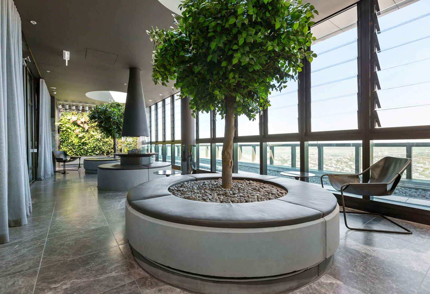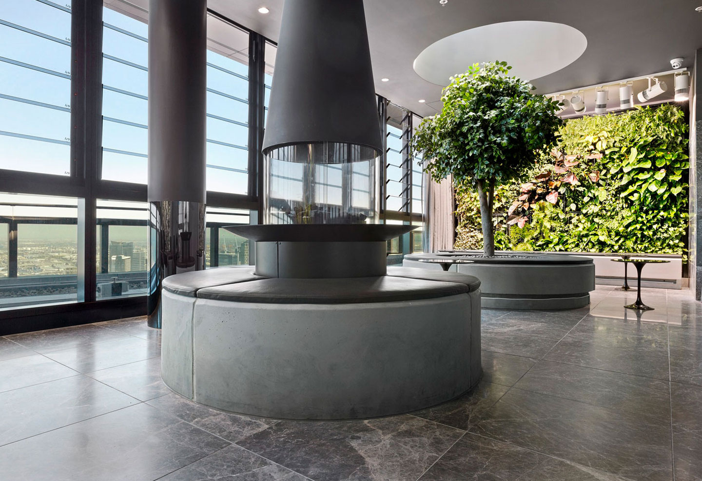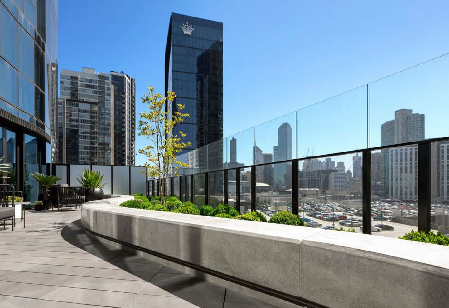 Anston (then SVC Urban) supplied multiple custom concrete bench seats to the Shadow Play development, which were installed on Levels 9 and 46 of the tower. Two truckloads of sleek grey concrete bench seat modules were lifted up from street level and expertly manoeuvred into place, to be situated around the perimeter of the open terraces and the rooftop bar.