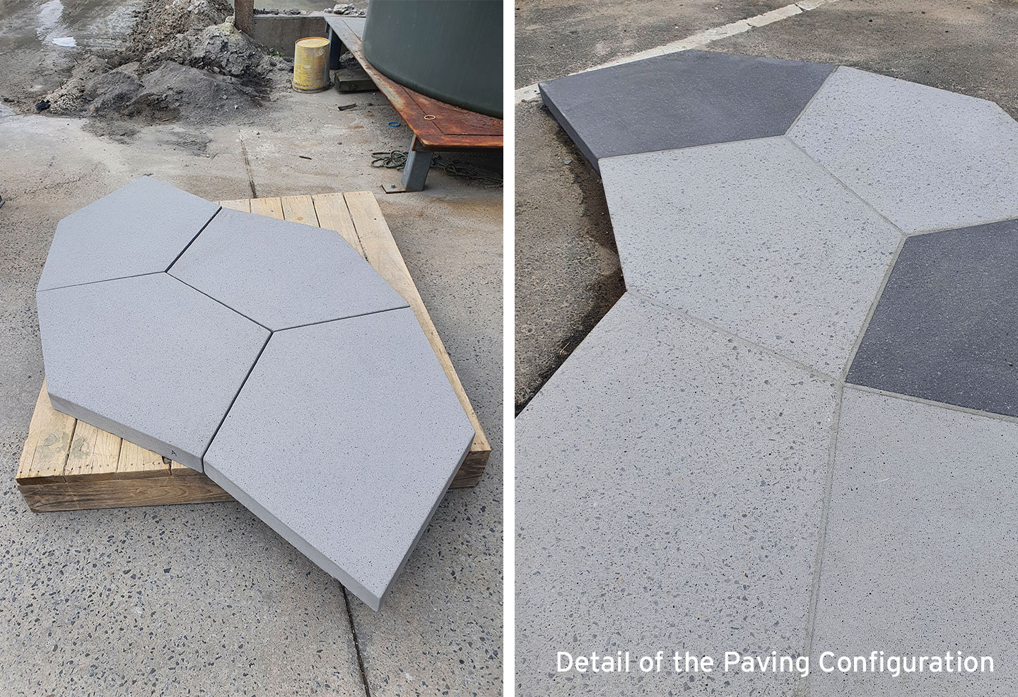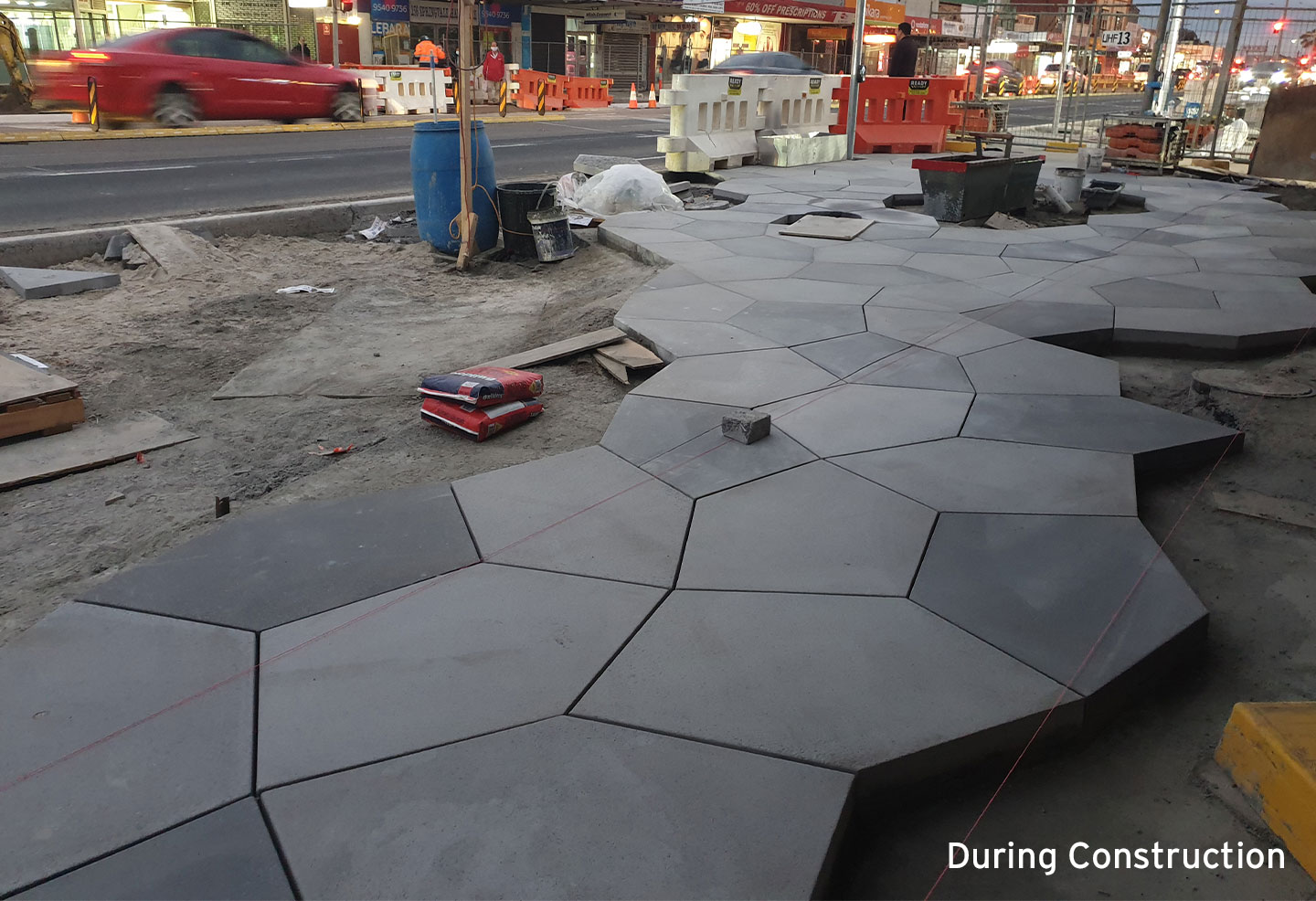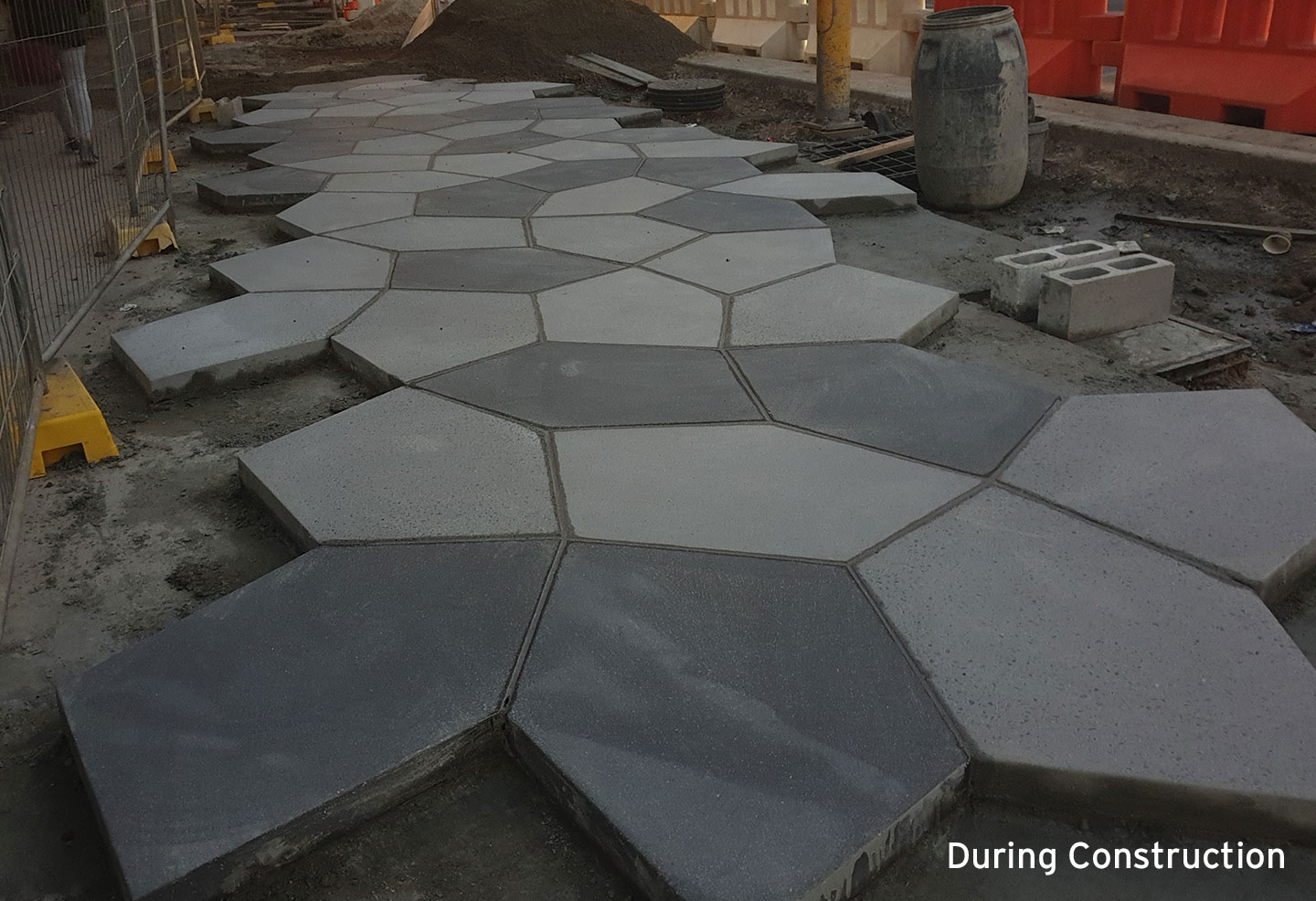 Installed by MACA Infrastructure, the design of the pavers are unique, formed in irregular pentagonal shapes that are mirrored and rotated to create an intricate paving configuration. Three different colours were utilised to make the once ordinary footpath pop. Following an extensive sampling process with the landscape architects, council and project teams, Char, Atlas and Atlas + Bluemetal were the final colours selected for the new streetscape.