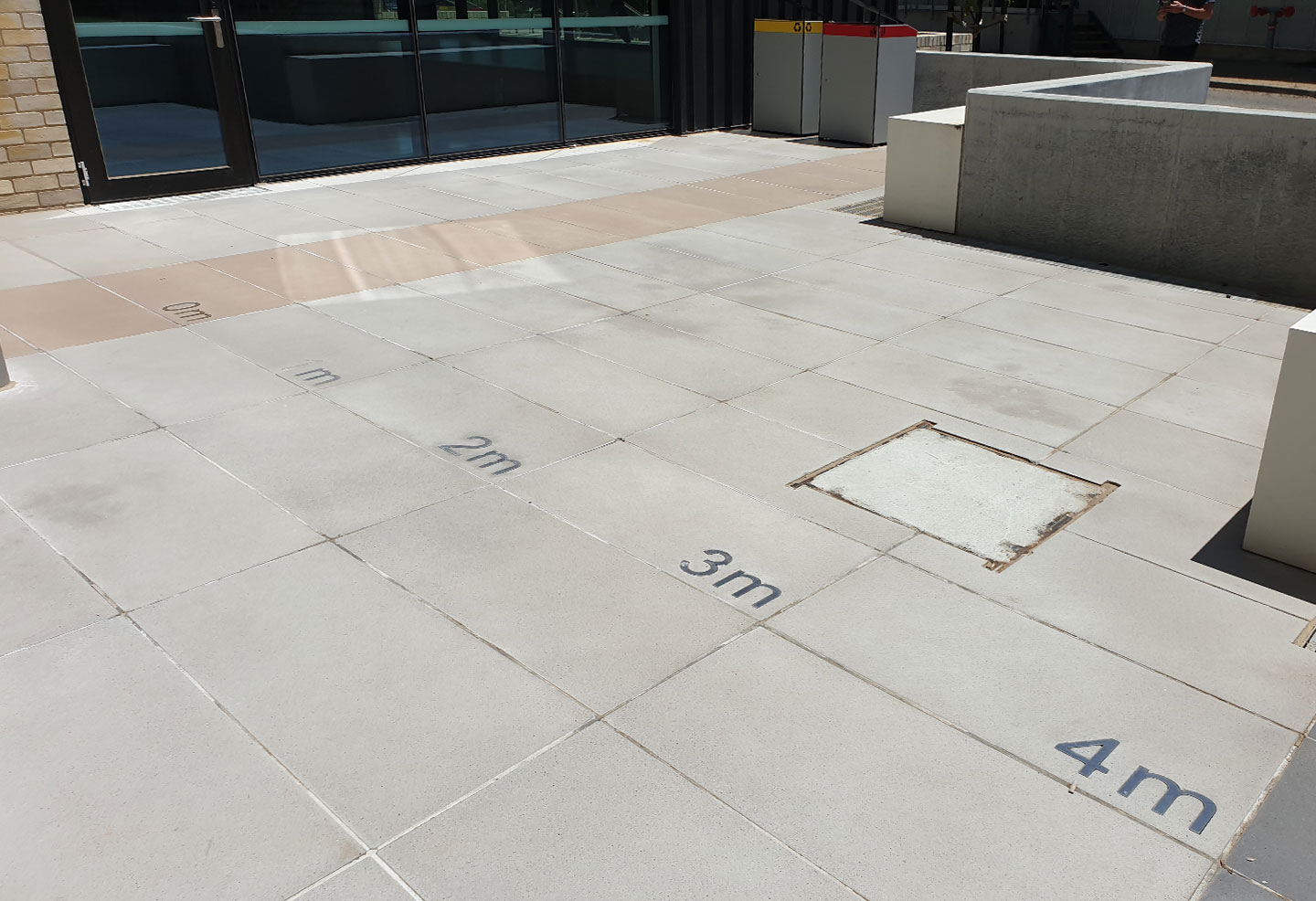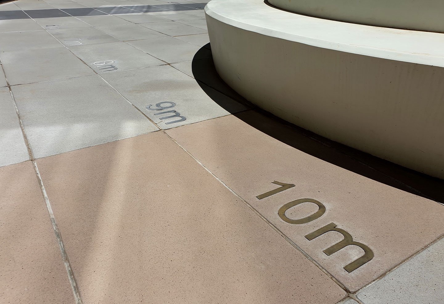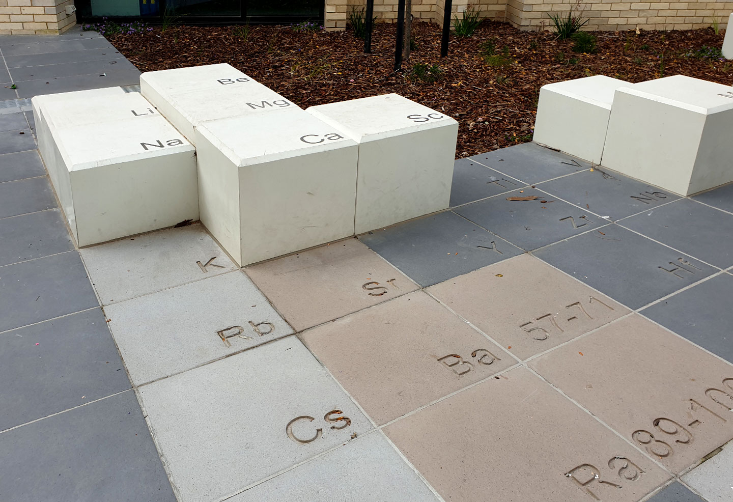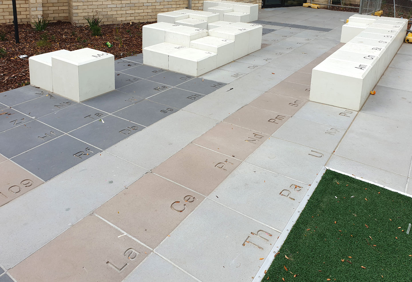 One section of paving creates a physical representation of the Periodic Table of Elements, set permanently within the schoolyard. Each paver is denoted with a unique chemical element symbol arranged precisely to mirror the structure of the periodic table, transforming a functional walkway into a large-scale interactive learning tool. Elsewhere, numerals are used to mark out 1-metre lengths. The subtly sparkling tones of the Granite pavers mirrors the shiny steel inlays, keeping the pavement refined and integrated with the surrounding architecture while still offering visual interest.