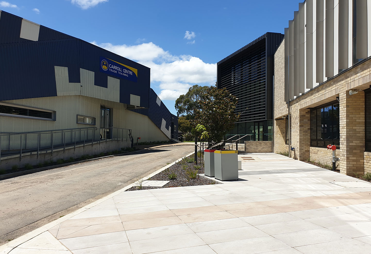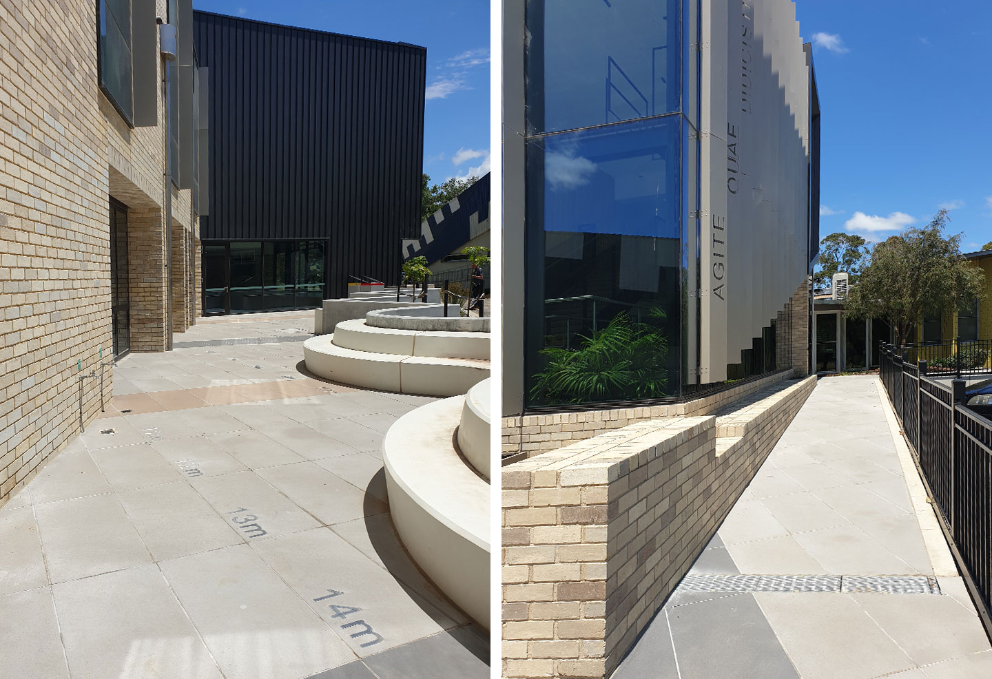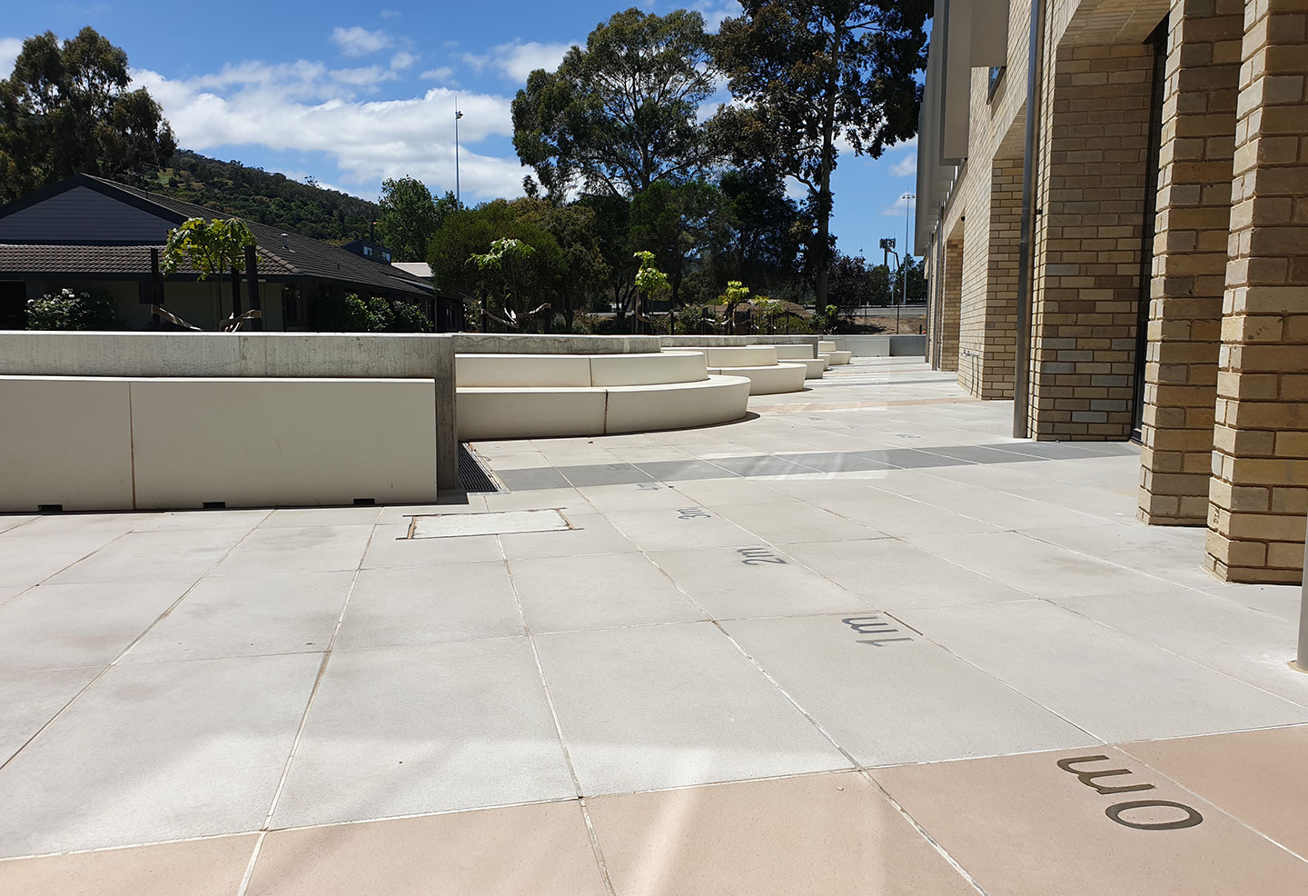 At St Joseph’s College in Ferntree Gully, the school courtyards and pavements feature custom-made concrete pavers by Anston. Crafted in three complementary colours of Vega, Orion, and Atlas, the pavers are engraved and inlaid with steel lettering and numerals.
