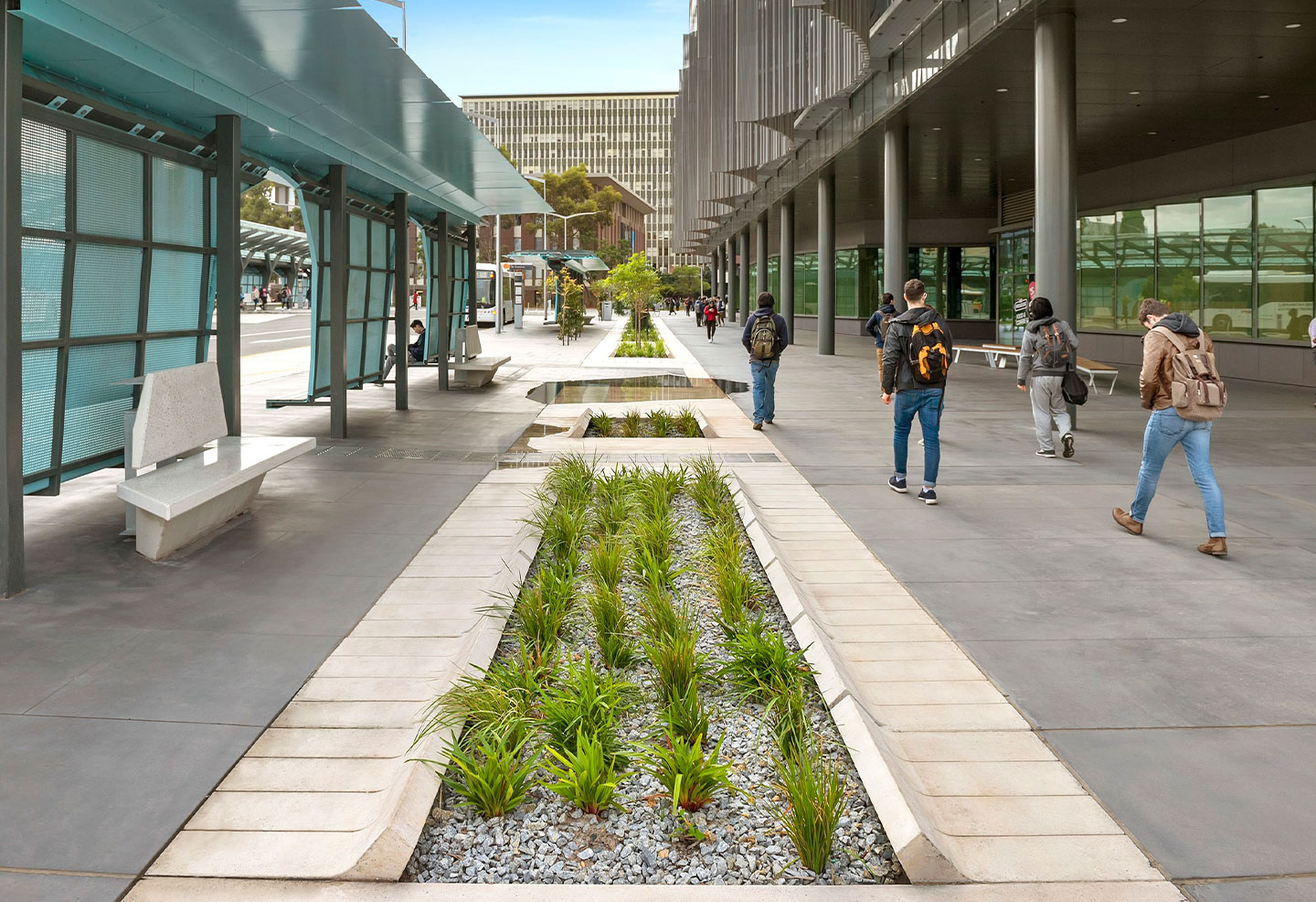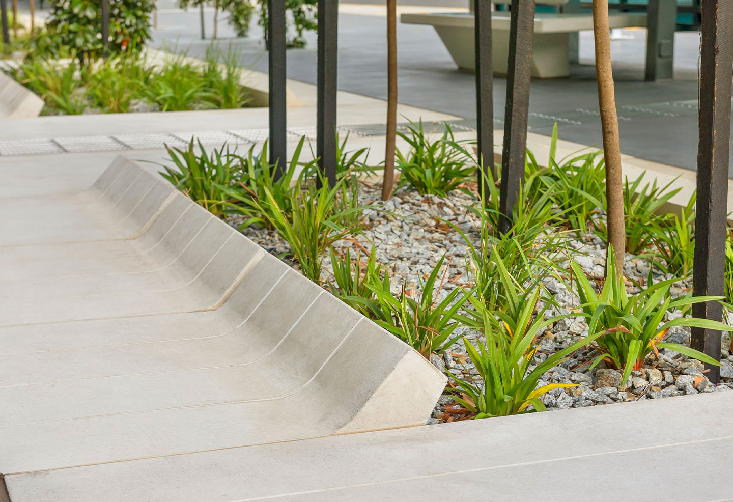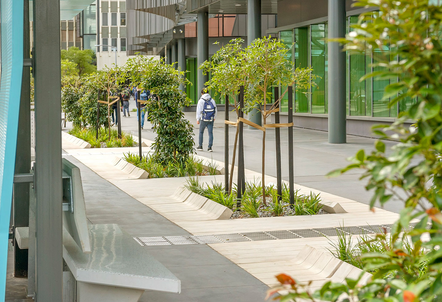 Located between the interchange and the new Learning & Teaching building are custom paving slabs by Anston (then SVC Urban) that form a threshold between the spaces, while subtly protecting the plantings in the garden beds. The paving slabs are designed with a slanting edge reaching upward to the sky, creating an eye-catching design detail.