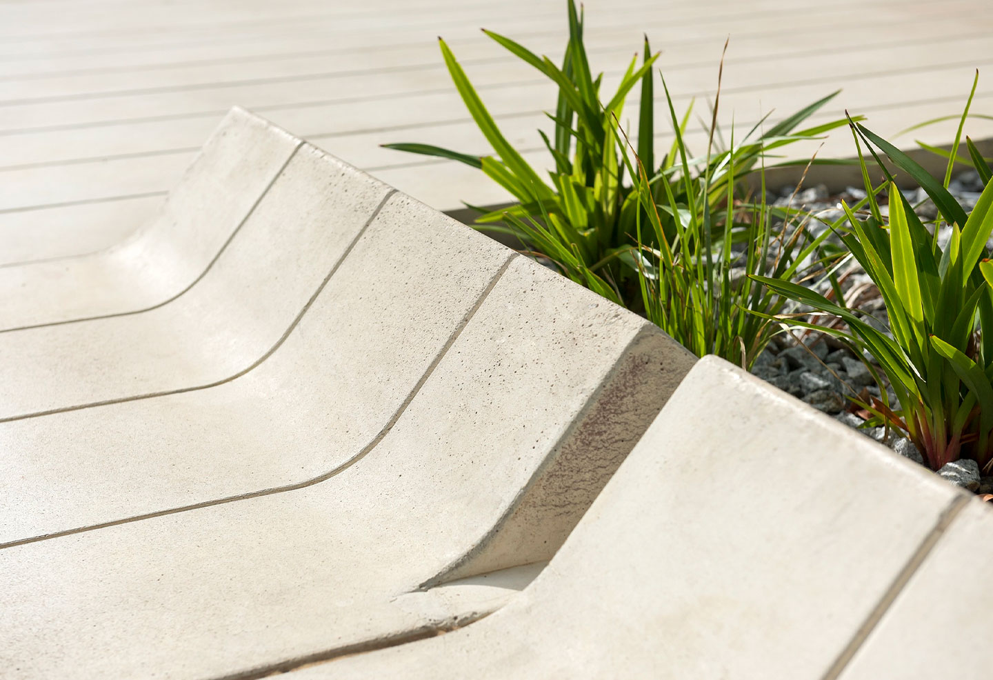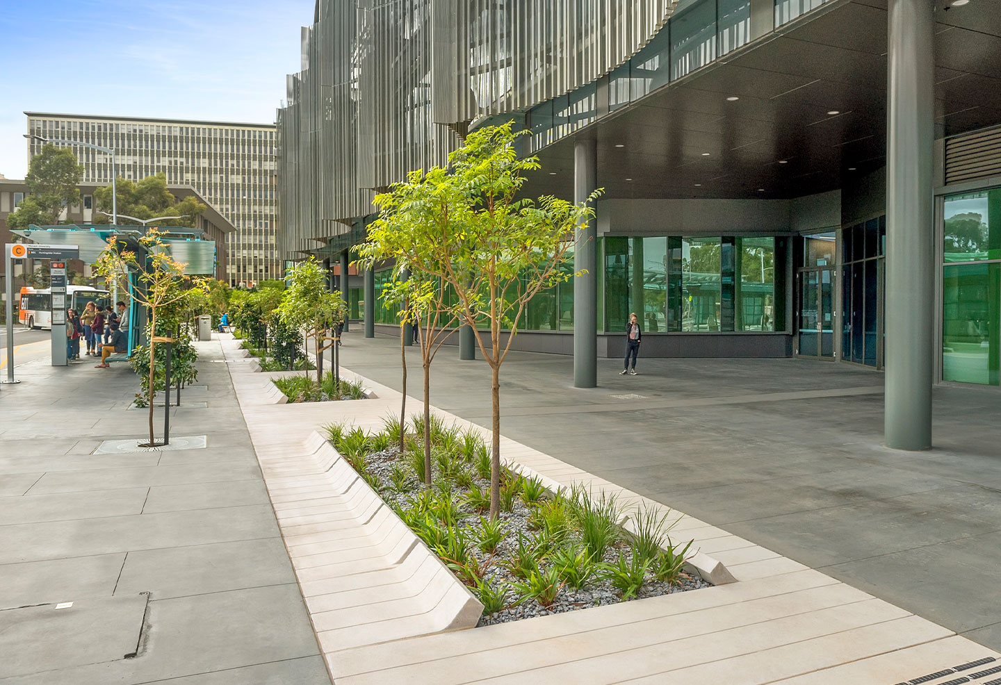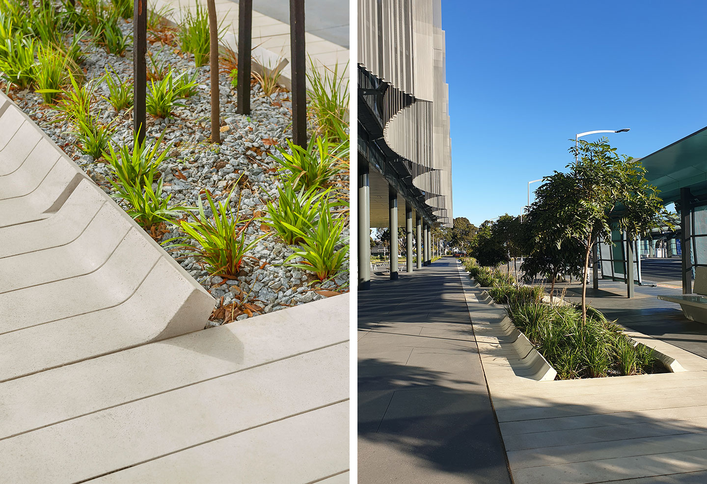 Located between the interchange and the new Learning & Teaching building are custom paving slabs by Anston (then SVC Urban) that form a threshold between the spaces, while subtly protecting the plantings in the garden beds. The paving slabs are designed with a slanting edge reaching upward to the sky, creating an eye-catching design detail.