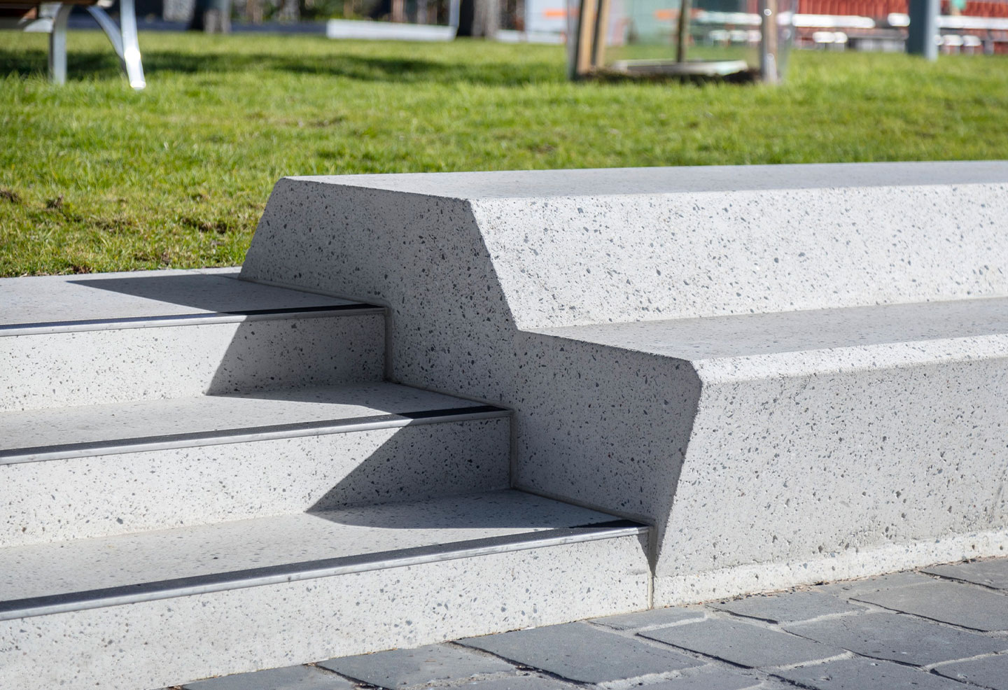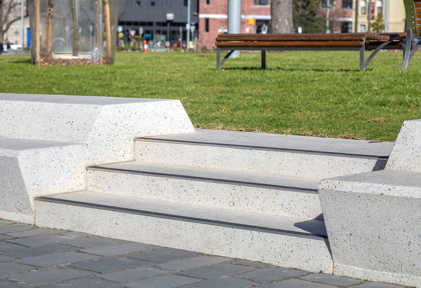 Anston (then SVC Urban) was contracted to supply several bespoke concrete seating modules and stair units, that would bridge the gap between the footpath and raised central lawn. The units were manufactured in a beautiful exposed aggregate concrete mix and honed for a smooth surface texture.