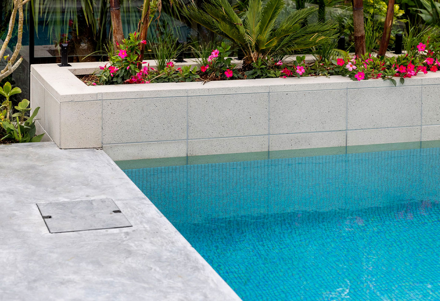 Architectural concrete provides excellent performance in pool areas, demonstrating a reliable combination of aesthetic appeal and practical functionality. The material’s excellent longevity and resistance to weather, water exposure and general wear and tear make it ideal for the harsh outdoor environment around pools, resisting moisture, UV rays, and temperature fluctuations.